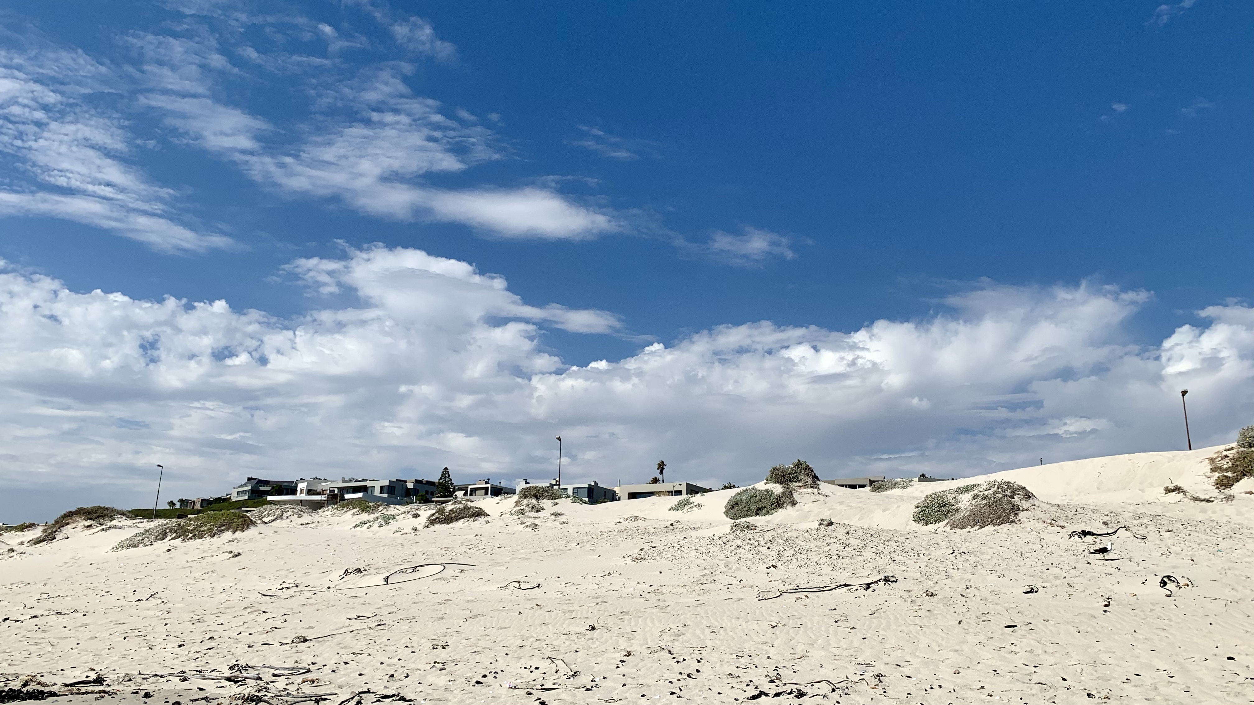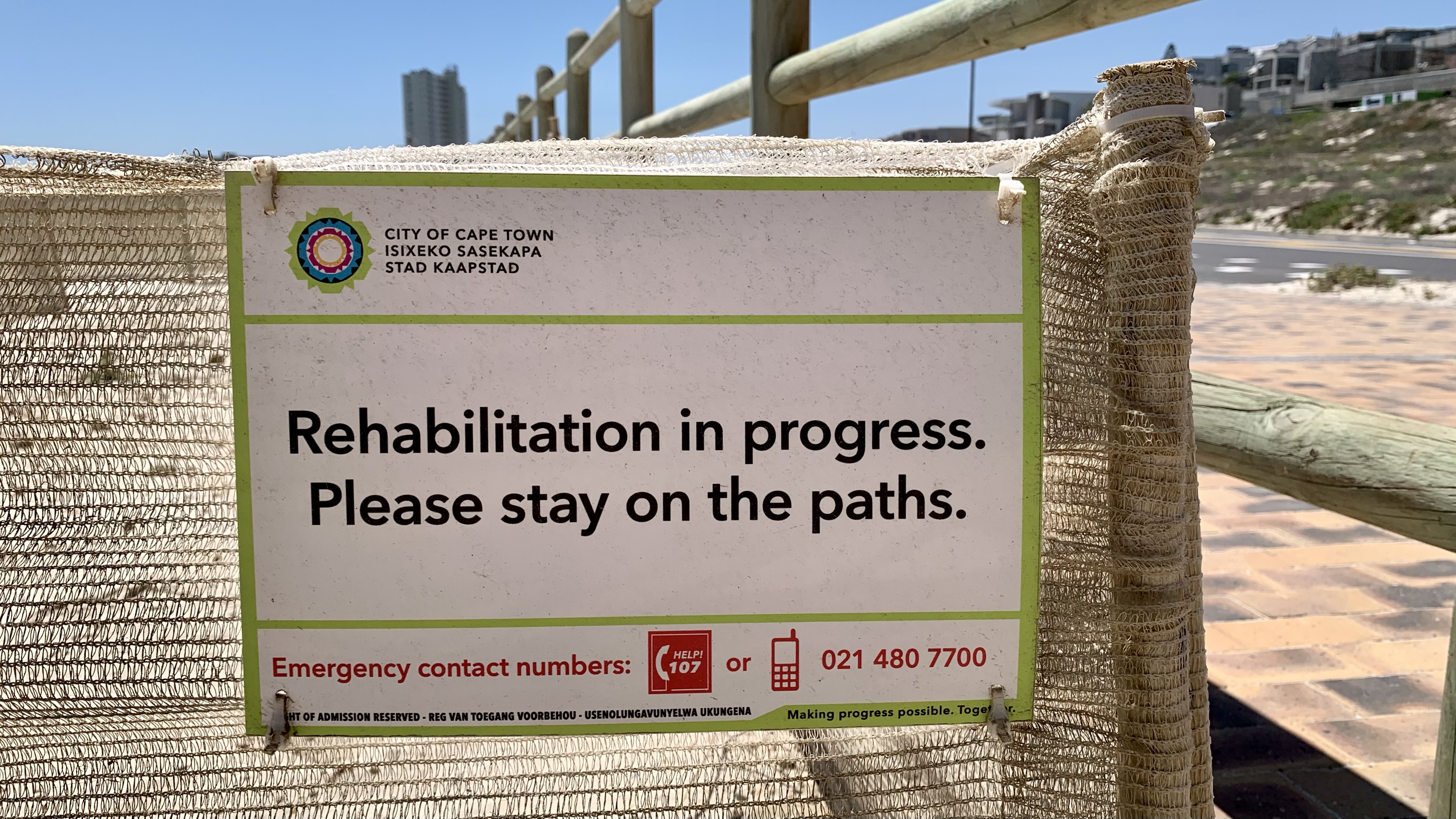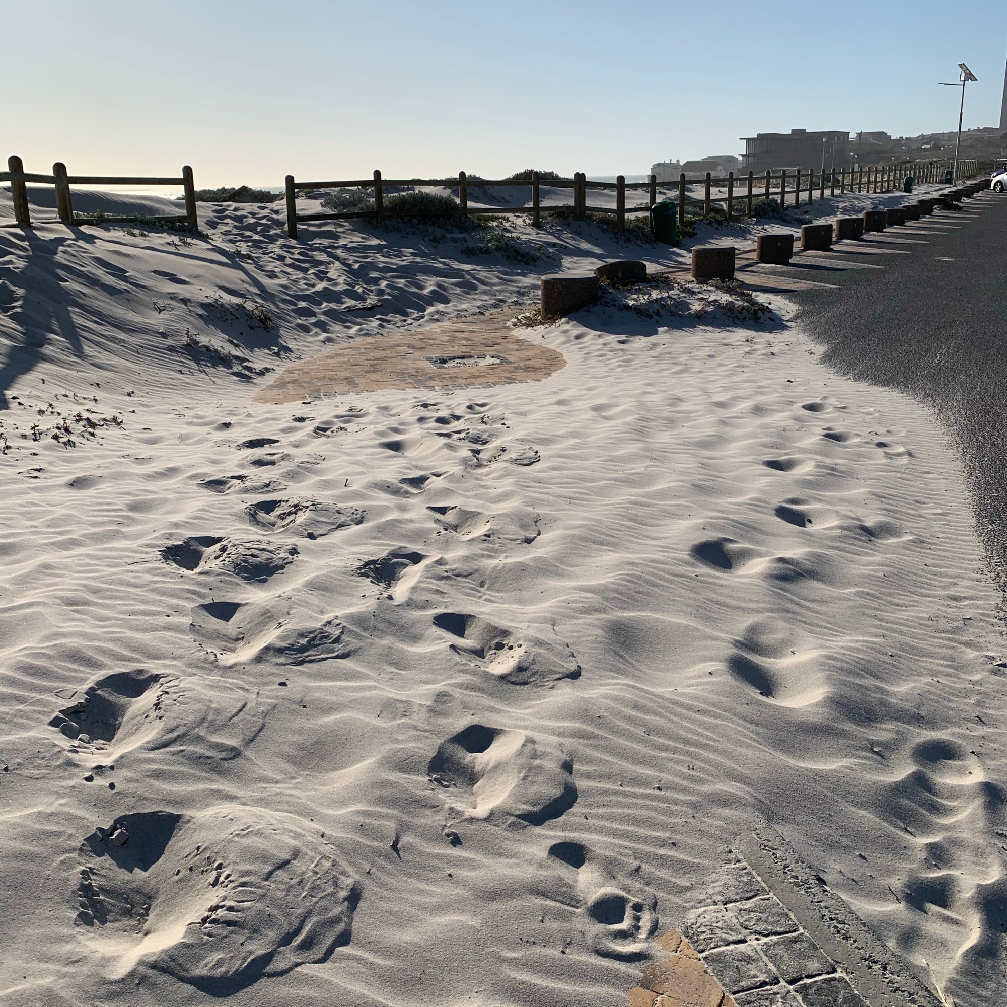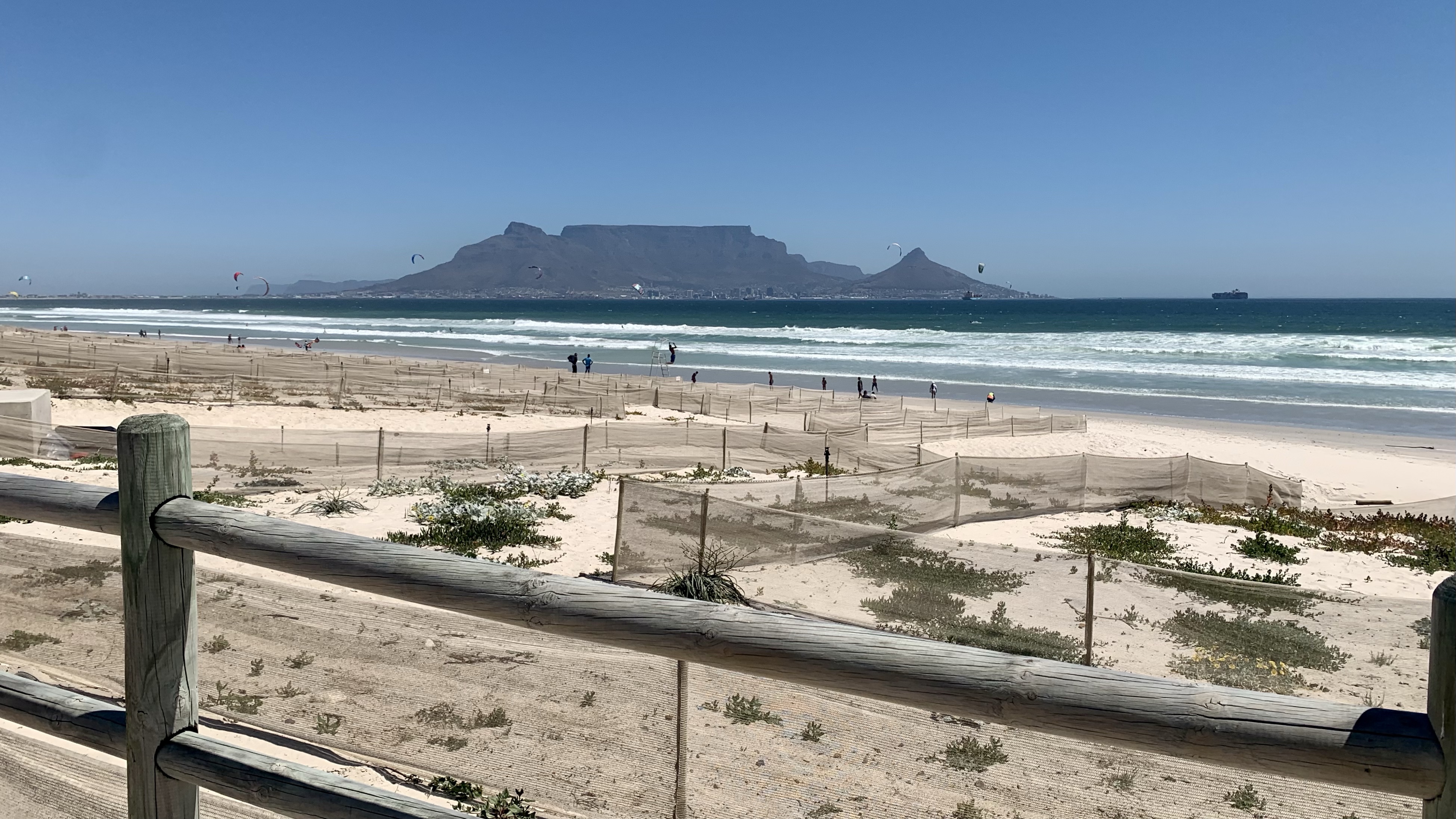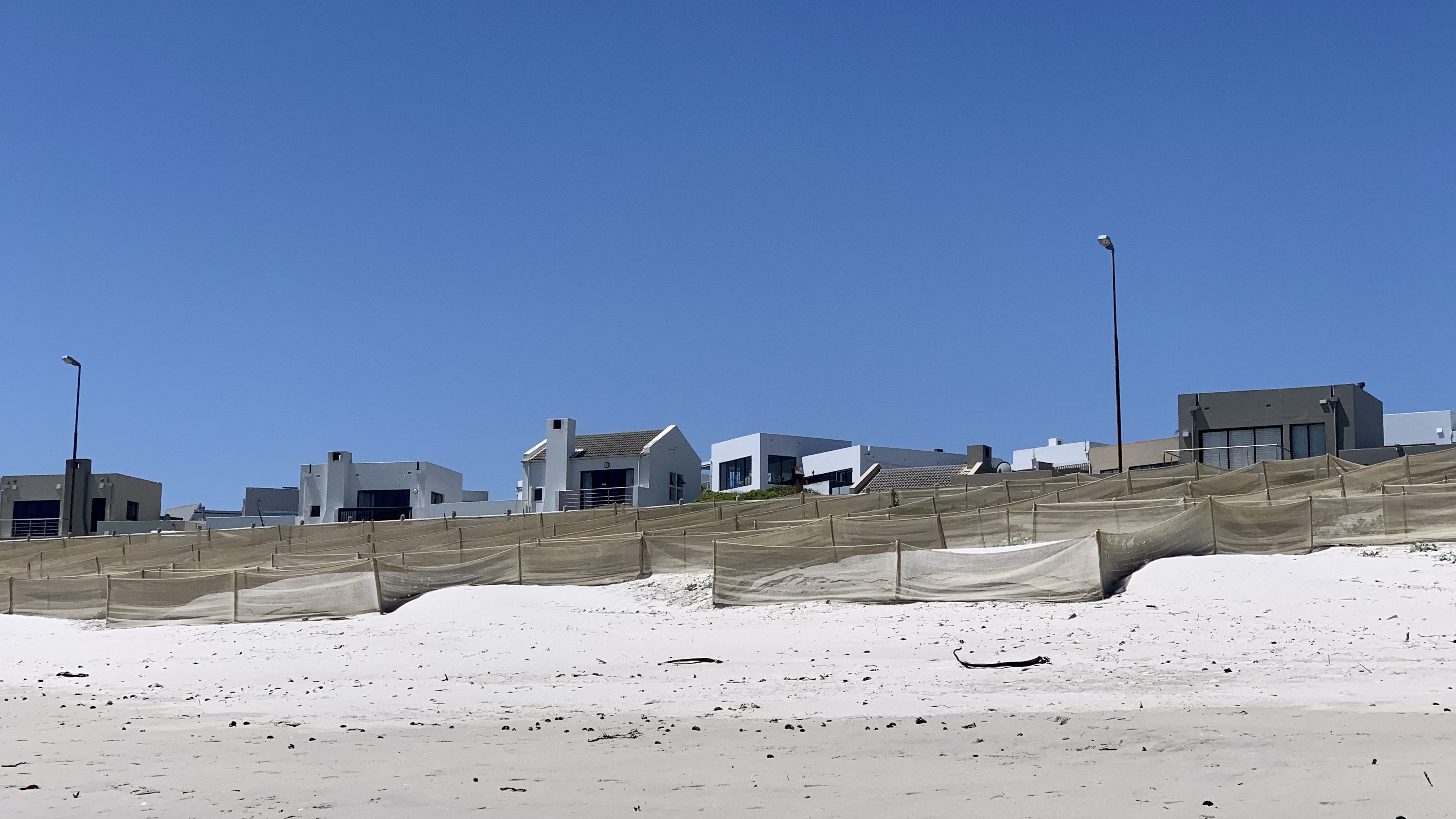 … stehen jetzt Netze. Sandfangnetze. Die Düne ist weg, vorerst jedenfalls. In Bloubergstrand, unserem zu Hause hier in Kapstadt, gehörten die Dünen zum Stadtbild wie der Eiffelturm zu Paris. Anders als in Paris weht hier an der Küste häufig ein ziemlicher Wind, der den Sand der Dünen ständig fortträgt. Und zwar weg vom Strand auf die Straße und die Gehwege. Der Sand lag oft so hoch, dass Fußgänger wie am Strand durch Sand liefen und Autos teilweise nur eine von zwei Fahrspuren nutzten. Etwas erinnerte uns – rein optisch – an zugeschneite Straßenabschnitte mit Schneeverwehungen auf Teilstrecken. Häufig konnten wir in der Vergangenheit beobachten, wie eine ganze Mannschaft an fleißigen Leute mit Schaufeln bewaffnet einem langsam die Straße langfahrenden LKW folgten und den Strandsand auf das Fahrzeug schippten.