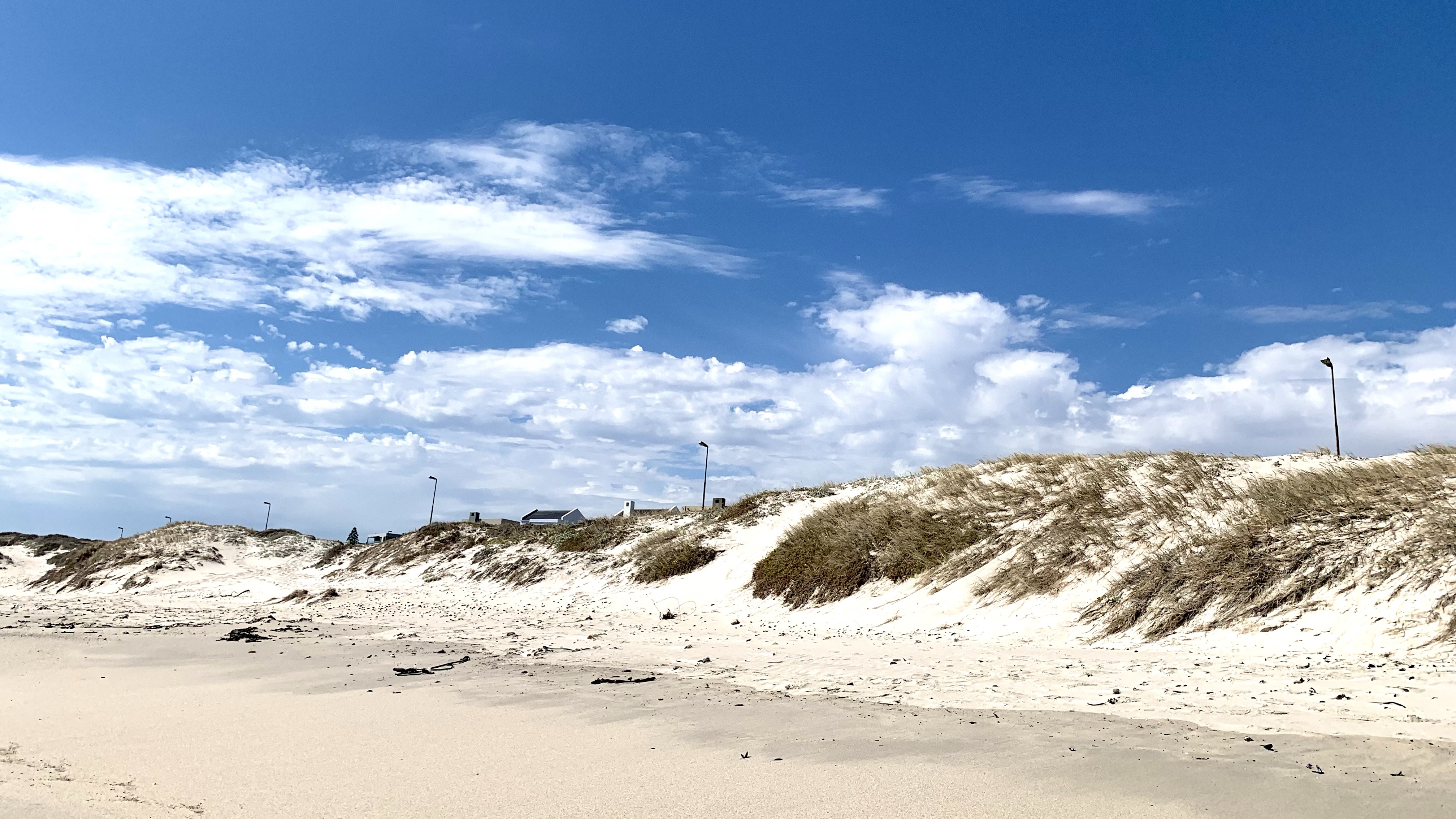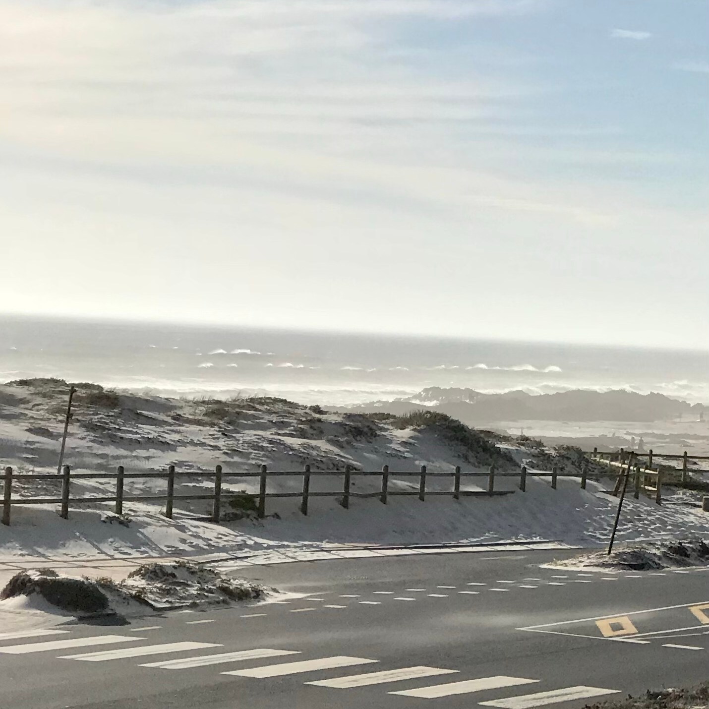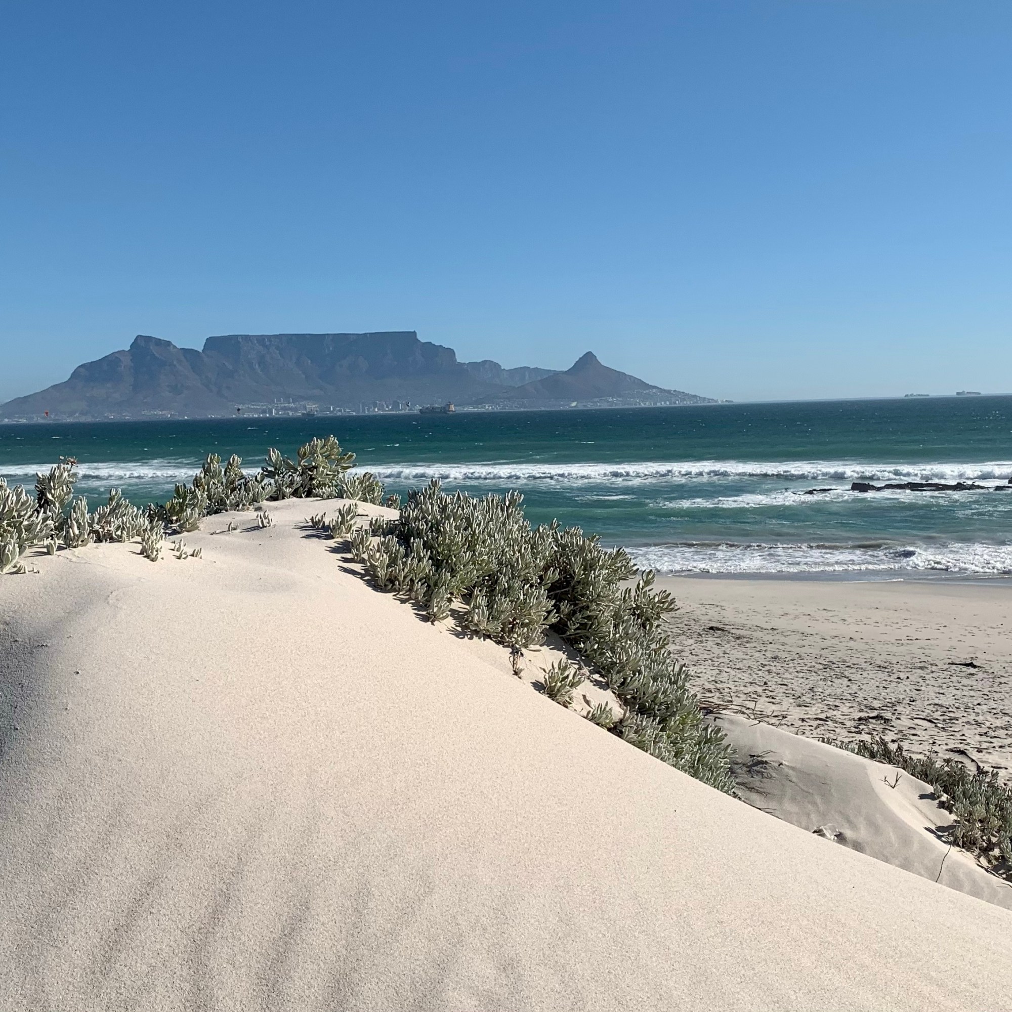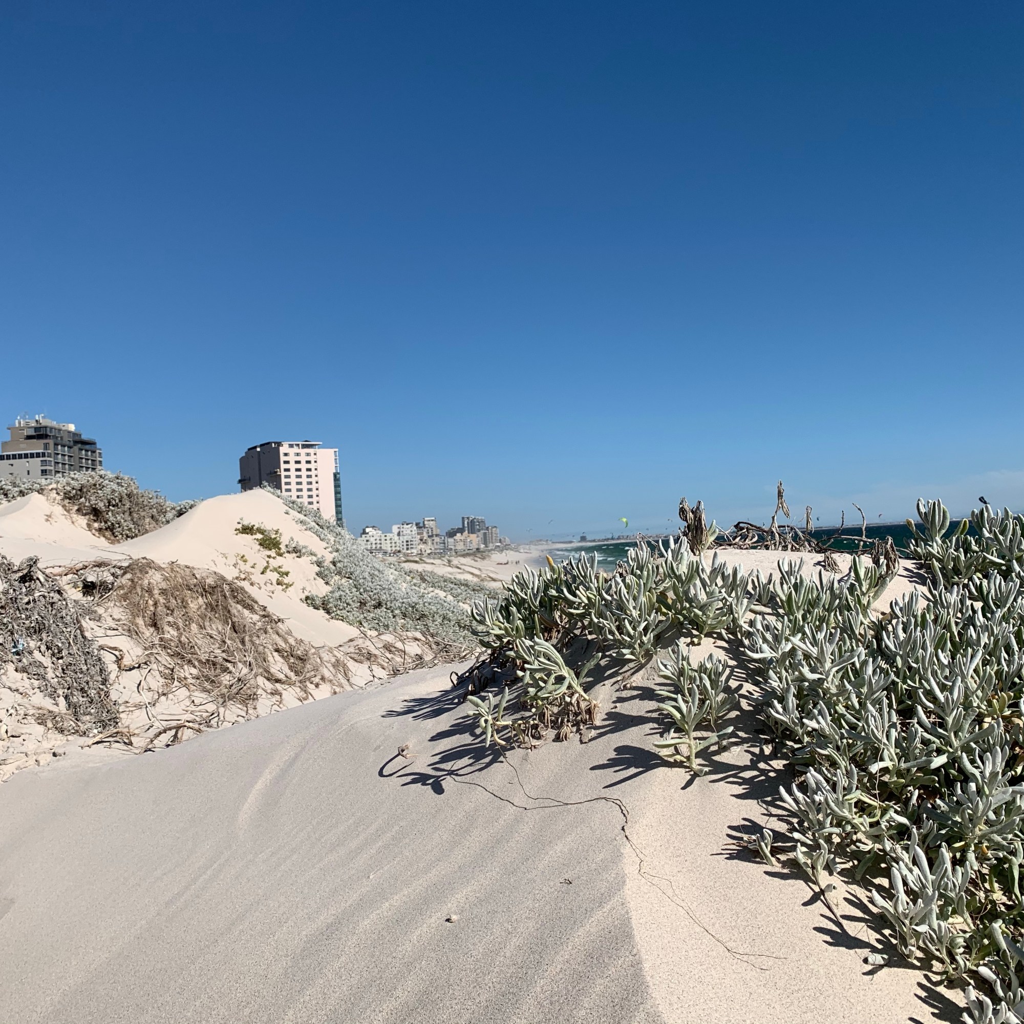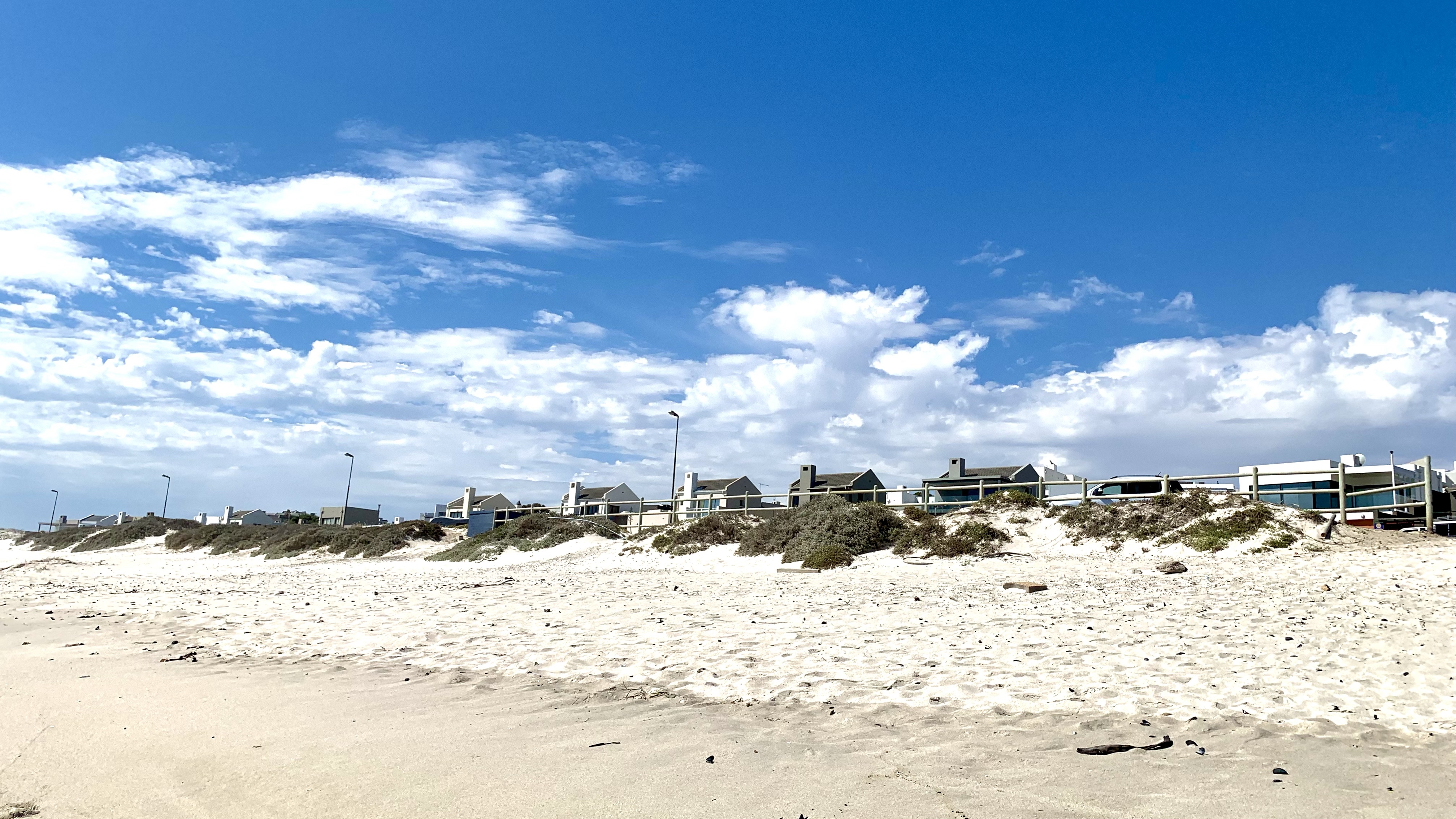 … stehen jetzt Netze. Sandfangnetze. Die Düne ist weg, vorerst jedenfalls. In Bloubergstrand, unserem zu Hause hier in Kapstadt, gehörten die Dünen zum Stadtbild wie der Eiffelturm zu Paris. Anders als in Paris weht hier an der Küste häufig ein ziemlicher Wind, der den Sand der Dünen ständig fortträgt. Und zwar weg vom Strand auf die Straße und die Gehwege. Der Sand lag oft so hoch, dass Fußgänger wie am Strand durch Sand liefen und Autos teilweise nur eine von zwei Fahrspuren nutzten. Etwas erinnerte uns – rein optisch – an zugeschneite Straßenabschnitte mit Schneeverwehungen auf Teilstrecken. Häufig konnten wir in der Vergangenheit beobachten, wie eine ganze Mannschaft an fleißigen Leute mit Schaufeln bewaffnet einem langsam die Straße langfahrenden LKW folgten und den Strandsand auf das Fahrzeug schippten.