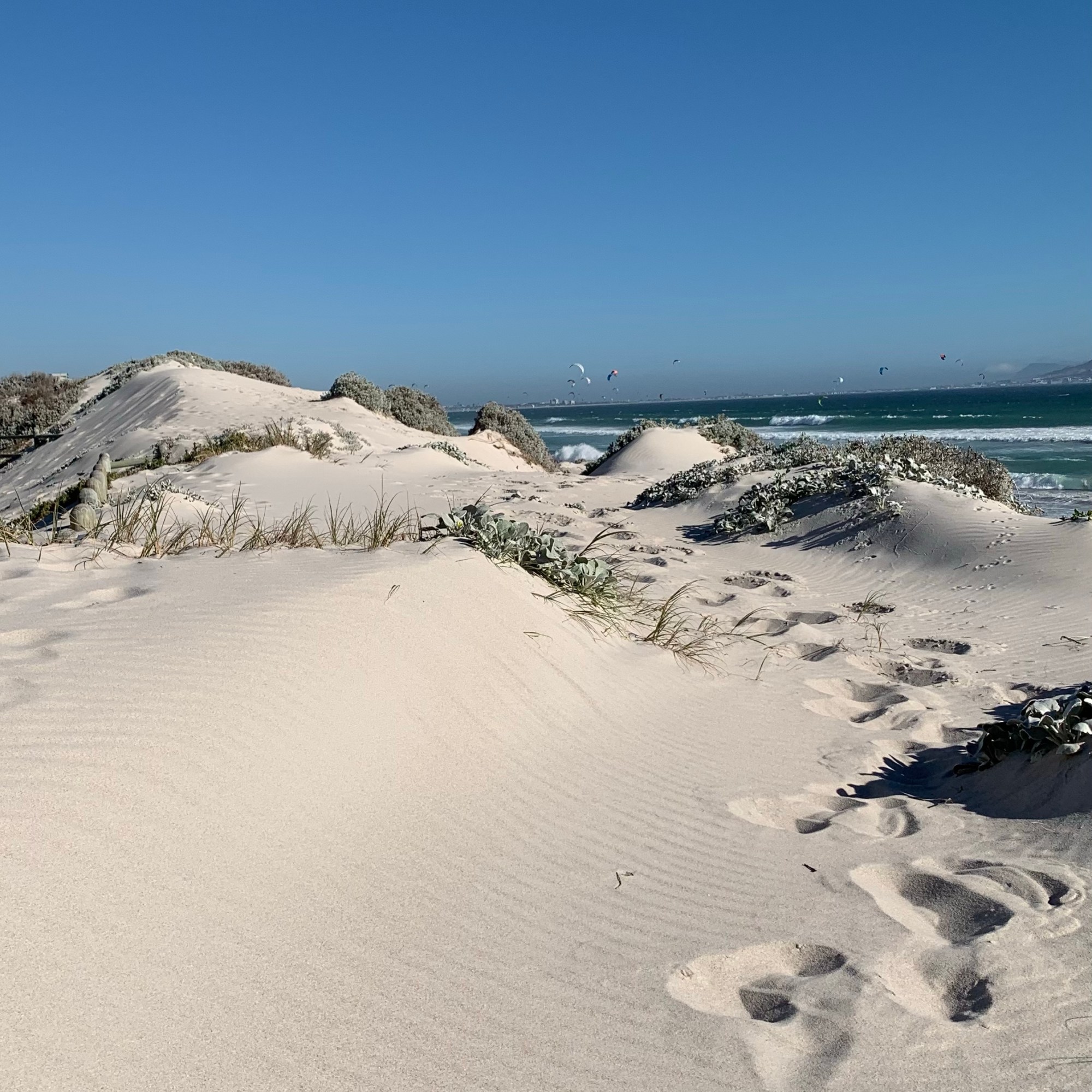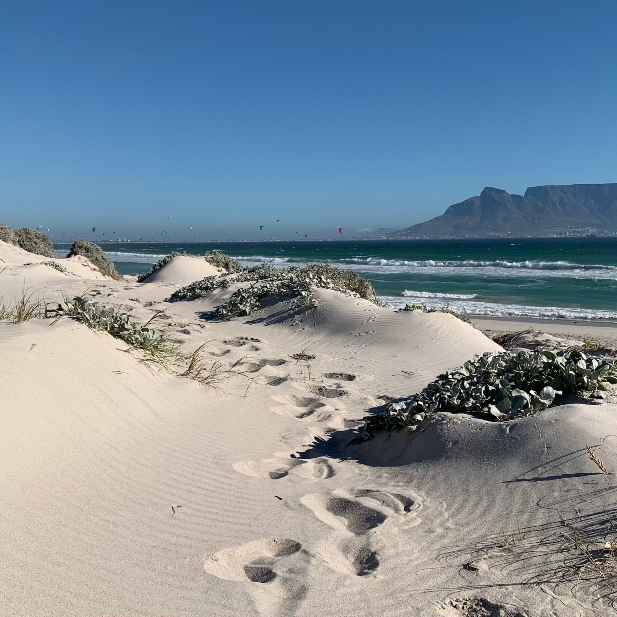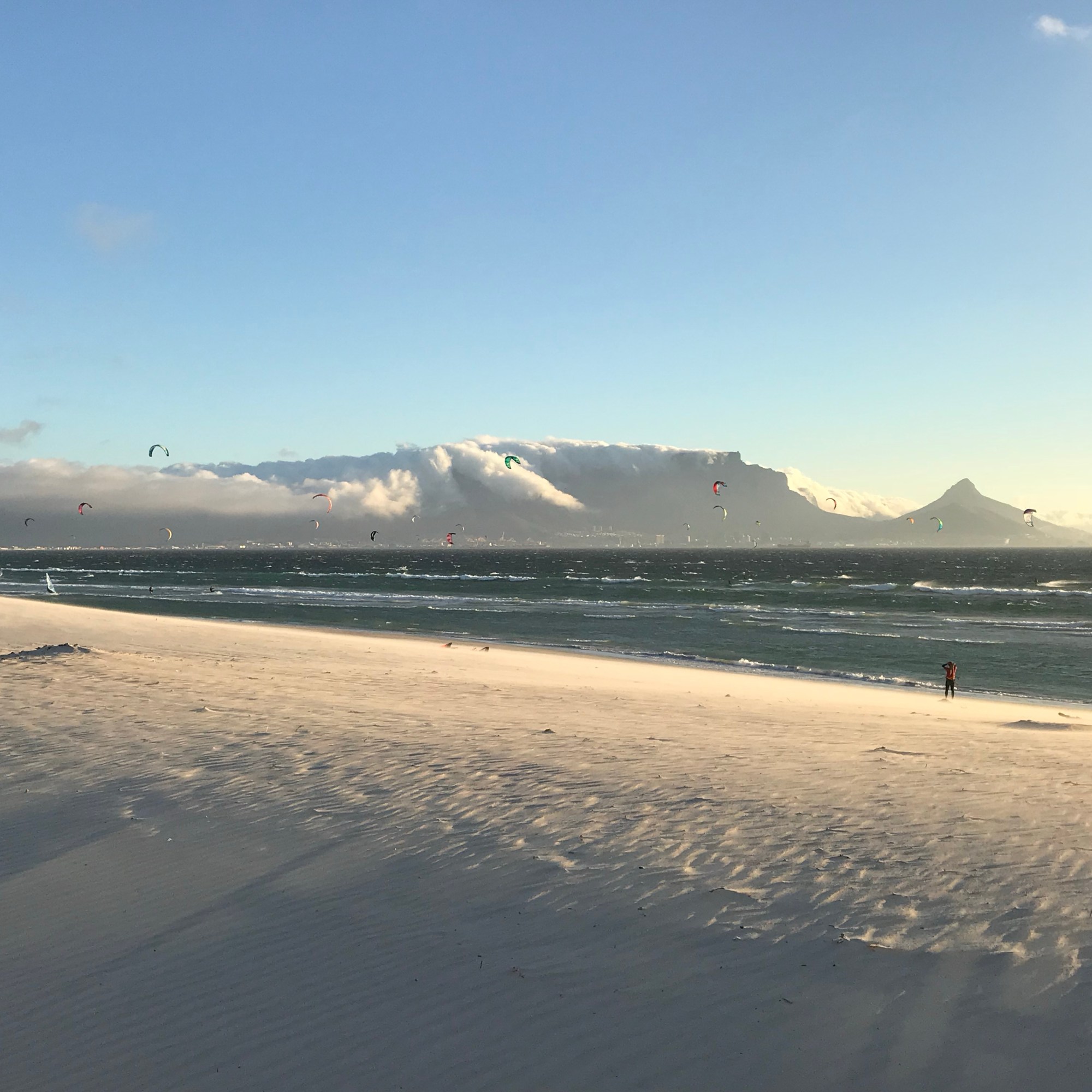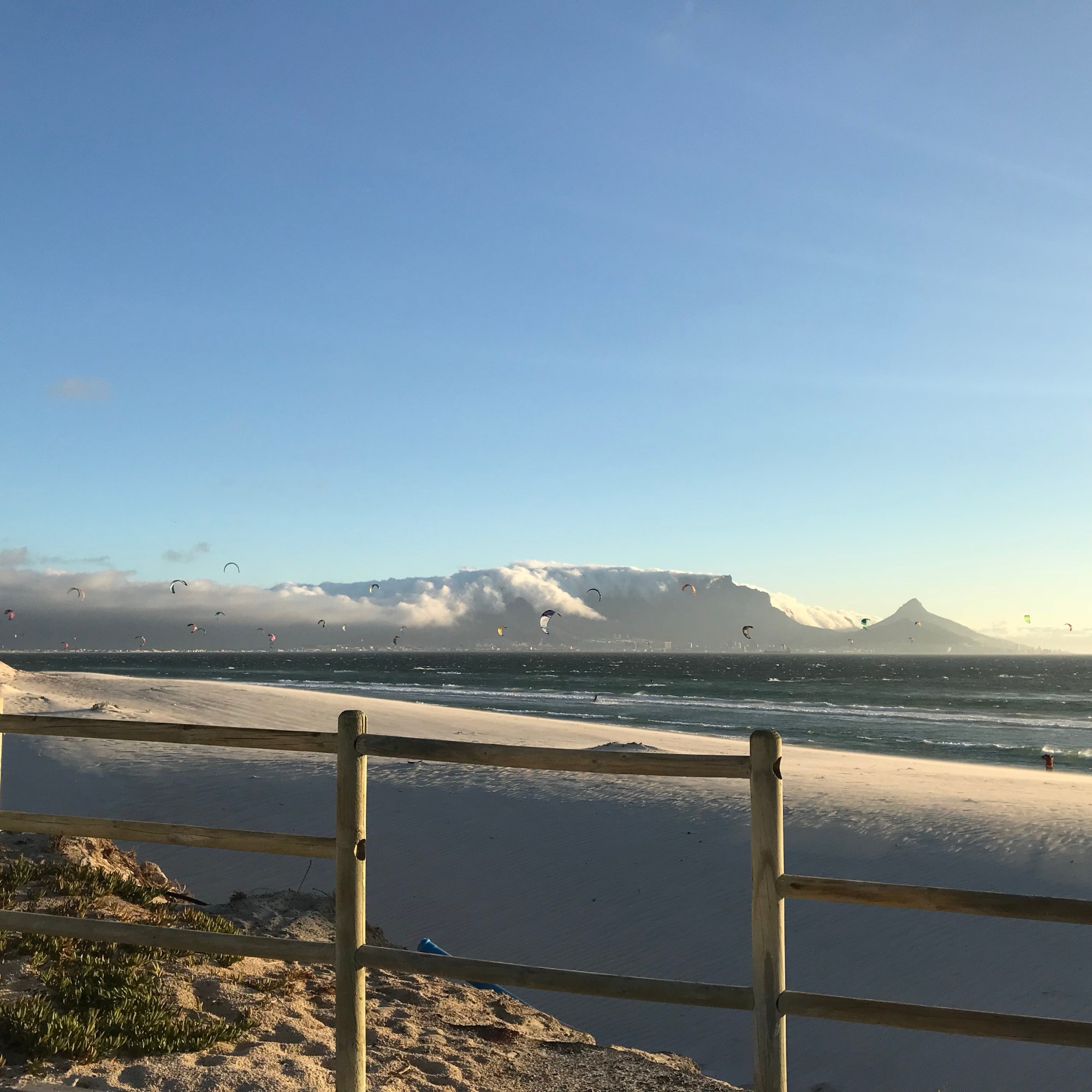 Schuld an diesen sich regelmäßig wiederkehrenden Aktionen ist der der ziemlich starke South-Eastern genannte Wind, der von der False Bay aus Richtung Kapstadt und Bloubergstrand das Kap umweht. Sein Spitzname lautet “Cape Doctor”, da er vom Frühjahr bis zum Herbst Smog und Verunreinigungen aus der Stadt herausbläst und mit seiner frischen Meeresluft viele Krankheiten zu vermeiden hilft, sagt man. Der South-Eastern weht in Bloubergstrand zuverlässig kräftig, nicht umsonst ist dieser Strandabschnitt als Kite-Surfing-Hotspot berühmt. Weltmeisterschaften werden hier alljährlich ausgetragen, und täglich zieht es hunderte Kitesurfer vorwiegend nachmittags gleichzeitig in den Himmel.