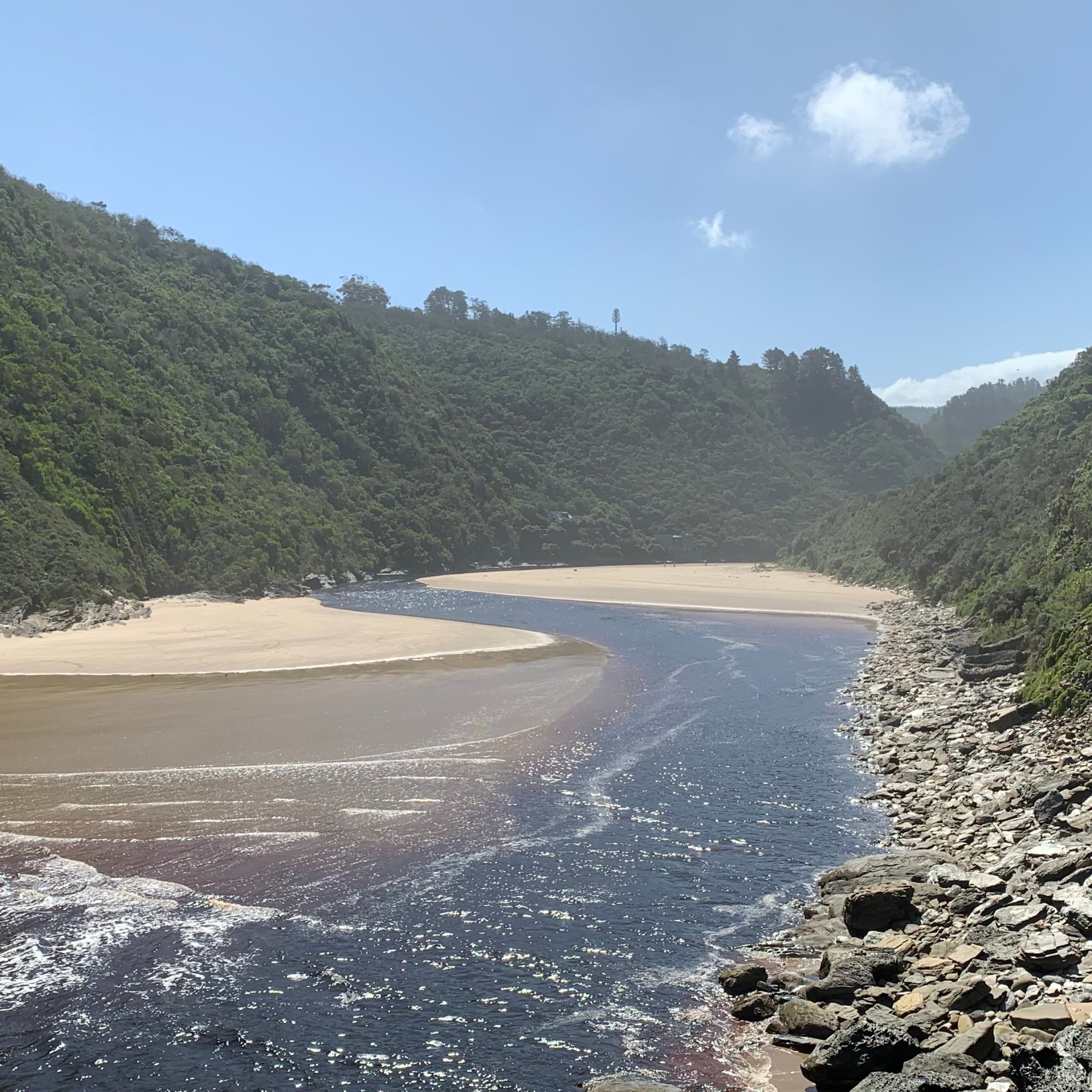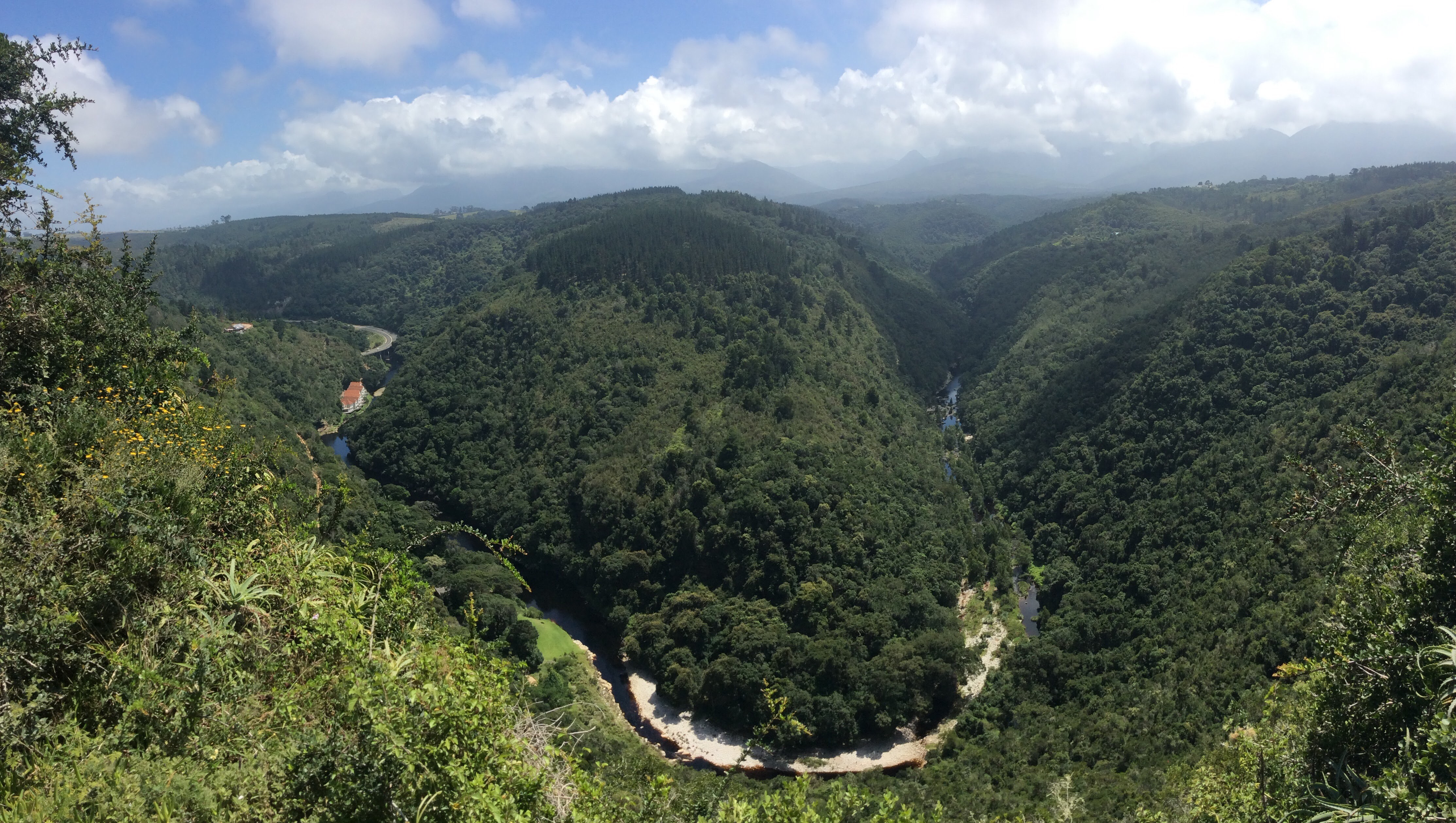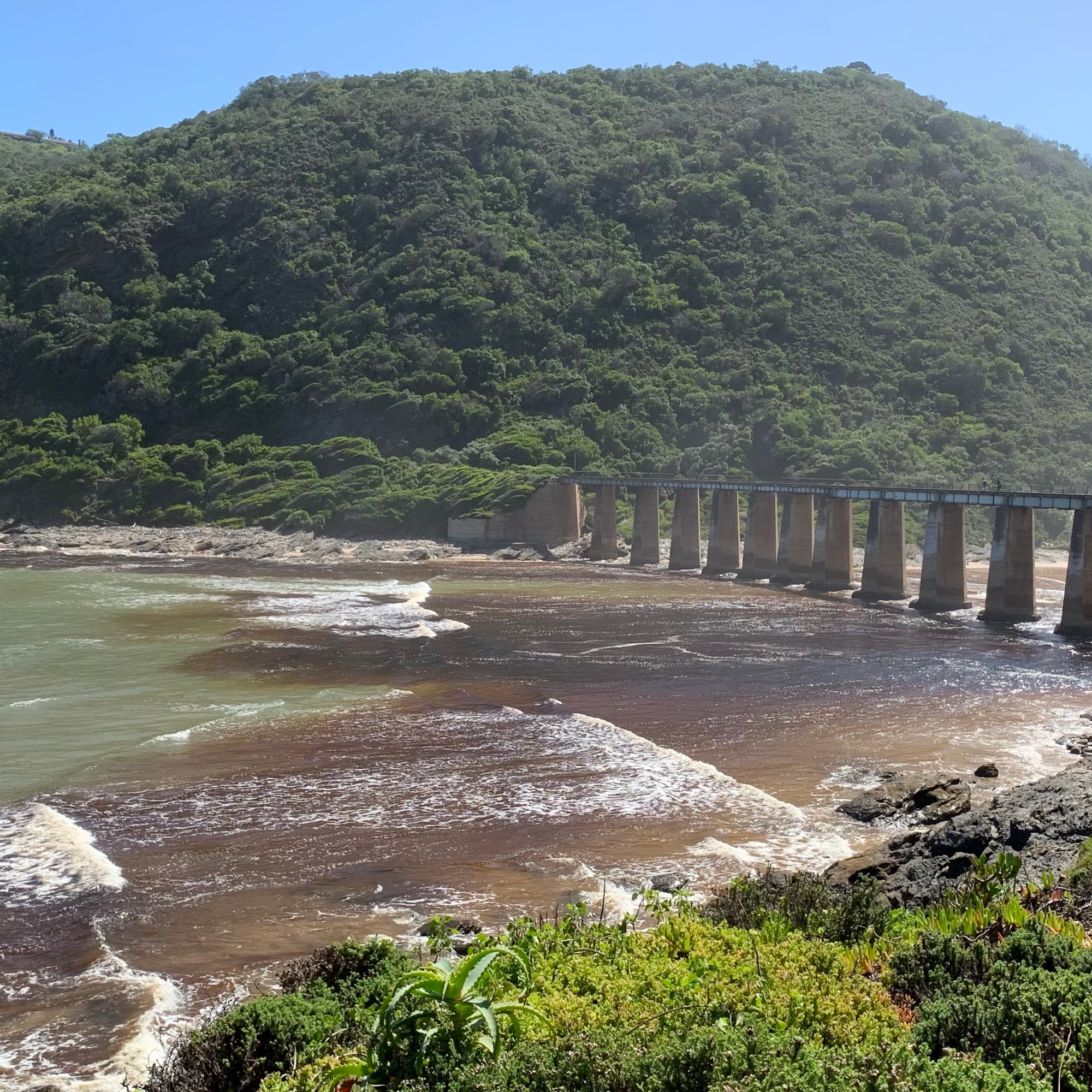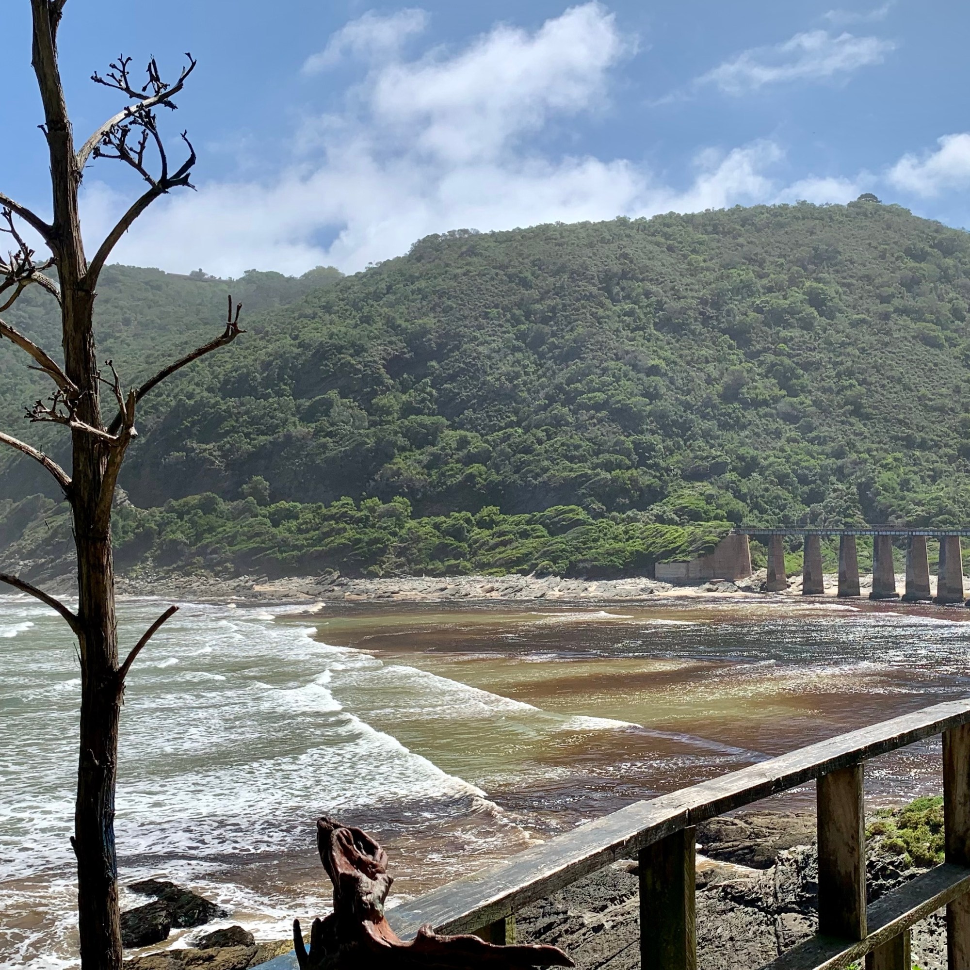 Nach dem Rundgang schlenderten wir auf der Terrasse vor der Höhle weiter in Richtung Westen, links der Ozean, rechts der grüne Hügel, an dem die Autobahn N2 sich entlang schlängelt. Bis wir dann endgültig stoppen mussten, nämlich vor der Eisenbahnbrücke über dem Kaimaans River, der einige zig Meter unter uns dramatisch das Wasser aus den Bergen gen Meer befördert. Die Jungs von der Höhle meinten, man könne über die Brücke weiter zur nächsten Bucht, nämlich zur Victoria Bay laufen, wenn man mutig ist. Aber wer ist das schon! Denn die 210 Meter lange Brücke, die von 1924 bis 1928 gebaut wurde, ist wie die frühere Bahnstrecke schon lange nicht mehr in Betrieb. Und so sieht sie auch aus. Die 15 Pfeiler stehen stabil im Boden und bei Flut auch umspült vom Ozean; die hält noch hundert Jahre. Aber die Gleisanlage obenauf ist weniger vertrauenserweckend. Die Stahlgleise werden wie üblich von Schwellen getragen, allerdings fehlt weitgehend der übliche Schotter zwischen den Gleisen, so dass der Blick nach unten direkt ins Meer fällt. Die Vorstellung, dass nicht nur der Blick sondern man selbst auch gleich hinterher fällt, ist alles andere als ermutigend, so dass wir von einer Überquerung der Brücke ganz schnell Abstand genommen haben. Interessant ist auch, dass Teile der Wasserversorgung für den Ort Wilderness durch Rohre sichergestellt wird, die über die Brücke und an der Höhle vorbeilaufen.