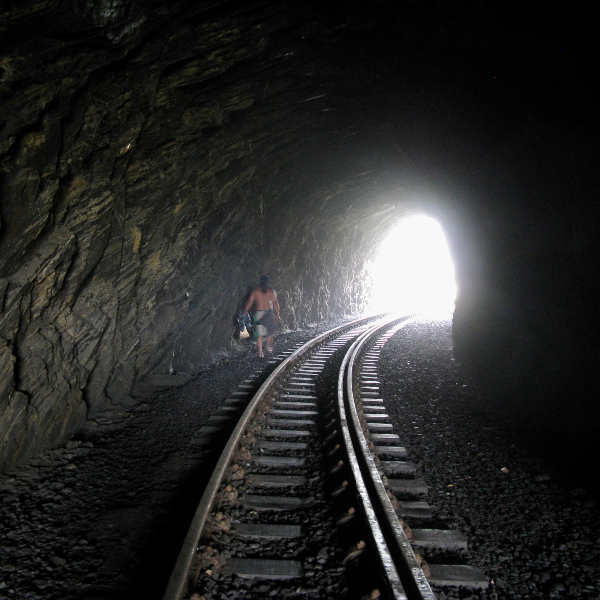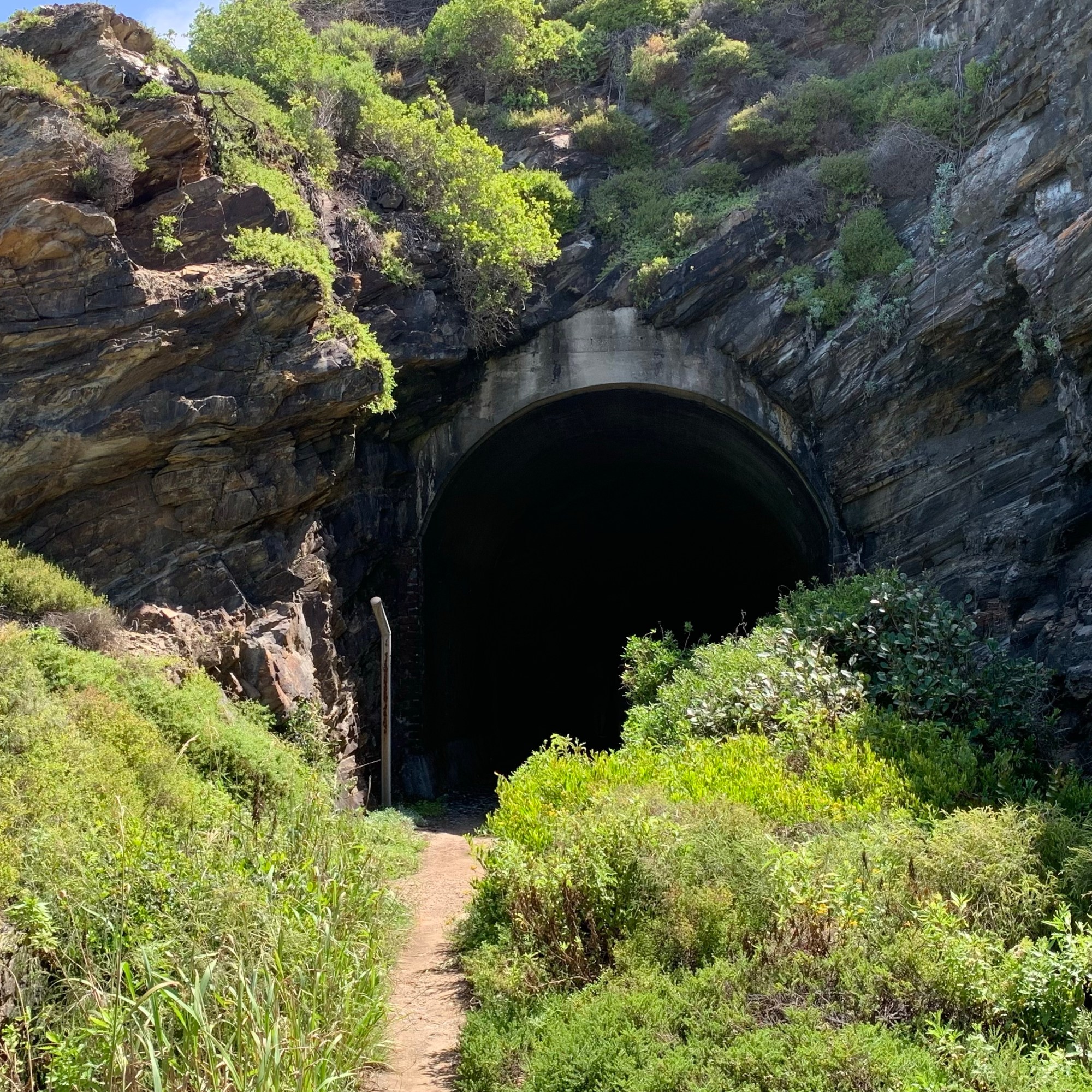 Wir marschierten also auf den Schienen Richtung Westen und liefen nach einigen hundert Metern direkt am ersten Verbotsschild vorbei, „Einfahrt verboten“ in Kombination mit dem Verbotsschild für Fußgänger. Bei unserem ersten Besuch vor 10 Jahren wären wir an dieser Stelle beinahe umgekehrt. Da wir nun aber wussten, was uns erwartet, ignorierten wir die Warnungen und gingen selbstbewusst über ein kleines, gut erhaltenes Viadukt weiter. Doch dann war plötzlich Schluss mit lustig, denn die Schienen lagen vor uns vergraben unter einem riesigen, mit Pflanzen bewachsenen Berg aus Sand, Stein und Geröll. Als 2006 nämlich langanhaltender Regen den Berg ins Rutschen brachte, landete ein großer Teil davon hier auf den Gleisen. Die Bahnstrecke ist seitdem blockiert und wurde trotz einiger Bemühungen nicht wieder reaktiviert. Und wir mussten nun sehr nahe am Abgrund zum unter uns tosenden Atlantik seitlich den abgeschmierten Berg entlangklettern, um irgendwann wieder auf die alten Bahngleise zu stoßen. Kurz hinter dem abgerutschten Berg öffnete sich uns dann ein großer, dunkler Schlund. So jedenfalls wirkt der Eingang zu einen Eisenbahntunnel, der sich vor uns auftat. Und irgendwie beschleicht einen jedes Mal das Gefühl, dass in jedem Moment eine schwere Dampflokomotive mit lautem Getöse begleitet von ganz viel weißem Rauch aus dem Tunnel herausschießen könnte. Früher war das bestimmt so. Heute gruselt es einem beim Anblick an den dunklen Zugang, an dessen Seite ein merkwürdiges Graffiti prangert. Denn der Tunnel macht in sich eine leichte Kurve, so dass sein Ende nicht zu sehen ist. Erst, wenn man sich einige Meter in den Tunnel vorgearbeitet hat, sieht man am Ende das Tageslicht hell strahlen. Die Schritte Richtung Tunnelausgang werden wieder mutiger und dann steht man plötzlich in einer anderen Welt. Wir hatten Kaaimans Grotto erreicht.