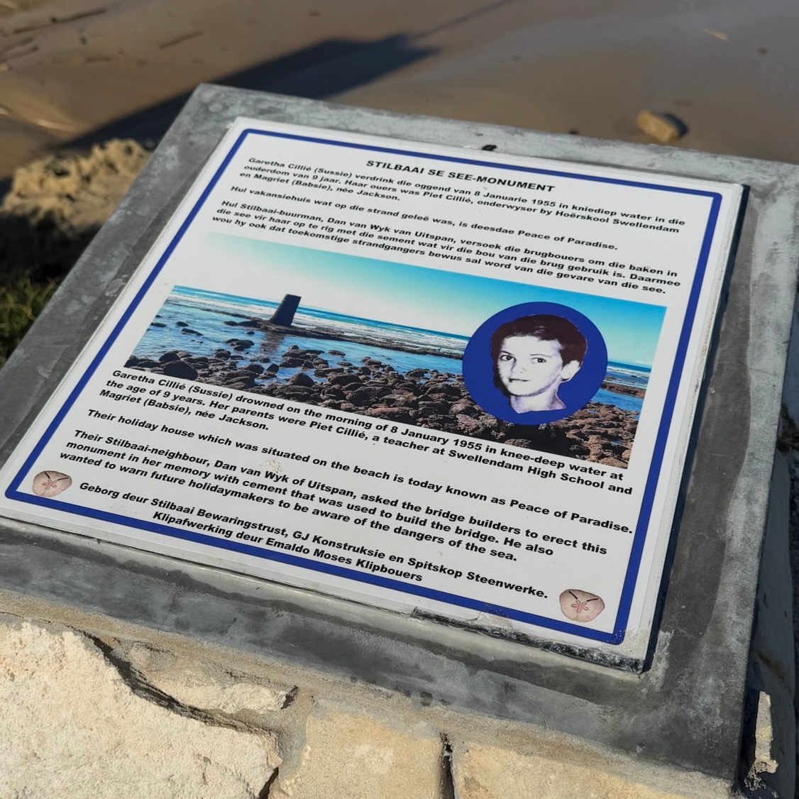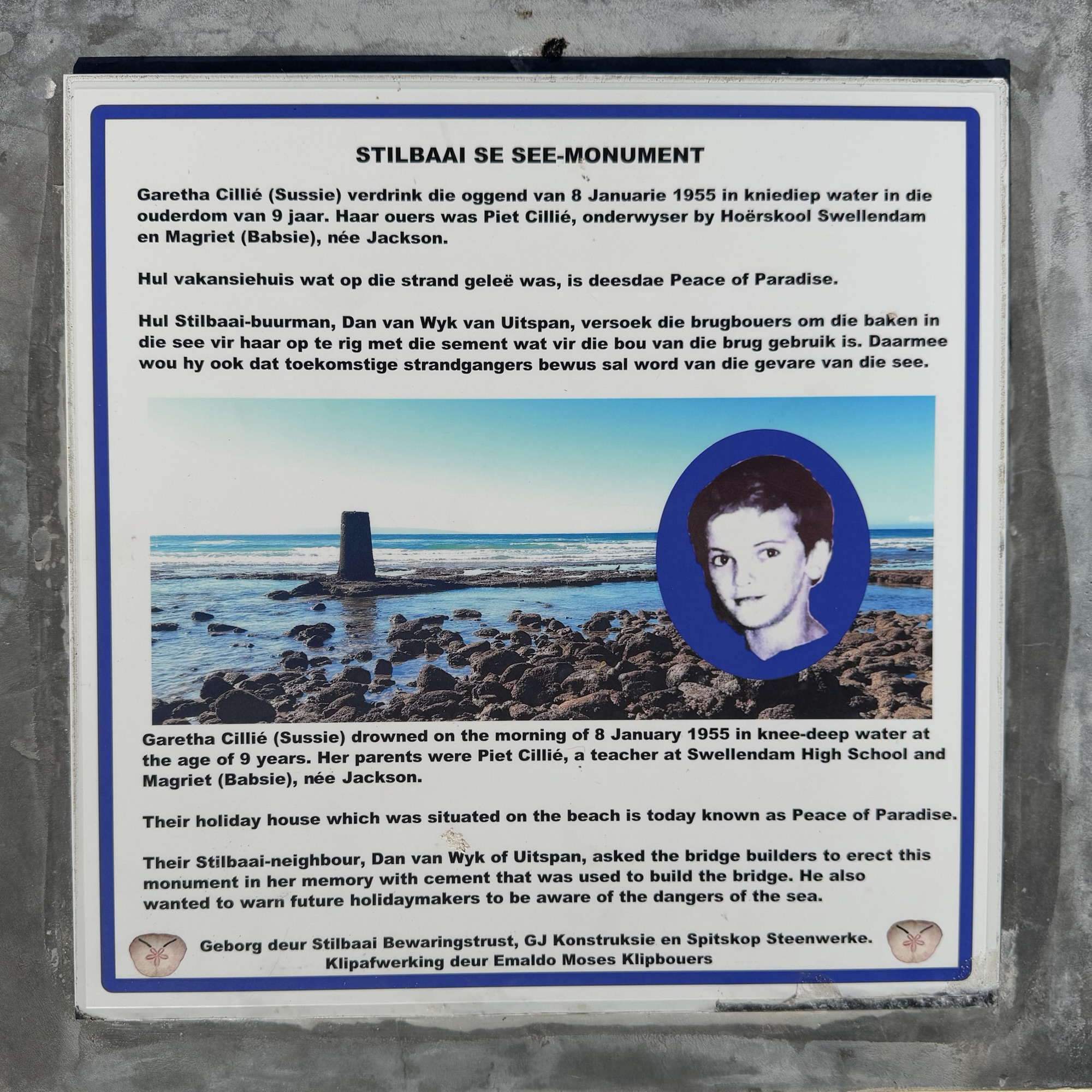 Zur Erinnerung an dieses tragische Unglück wurde ein Denkmal gebaut, das heute noch immer an der Stelle steht, an der das Mädchen ertrank: eine Säule aus Beton mitten im Indischen Ozean. Der Brückenbauer von Stilbaai wurde gefragt, ob er aus dem gleichen Material wie die Brücke über den Fluss nun auch das Monument errichten würde. Das Denkmal wurde gegenüber dem Strandhaus gebaut, das der Familie Cillié einst gehörte und von ihnen als Feriendomizil genutzt wurde. Da die Erinnerungen an das Unglück zu traurig waren, wurde es später verkauft. Das Haus existiert heute unter dem Namen „Peace of Paradise“.