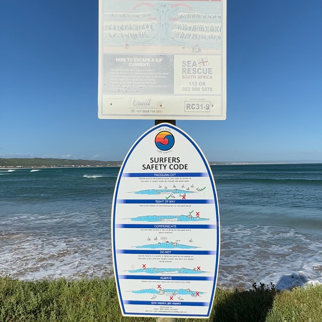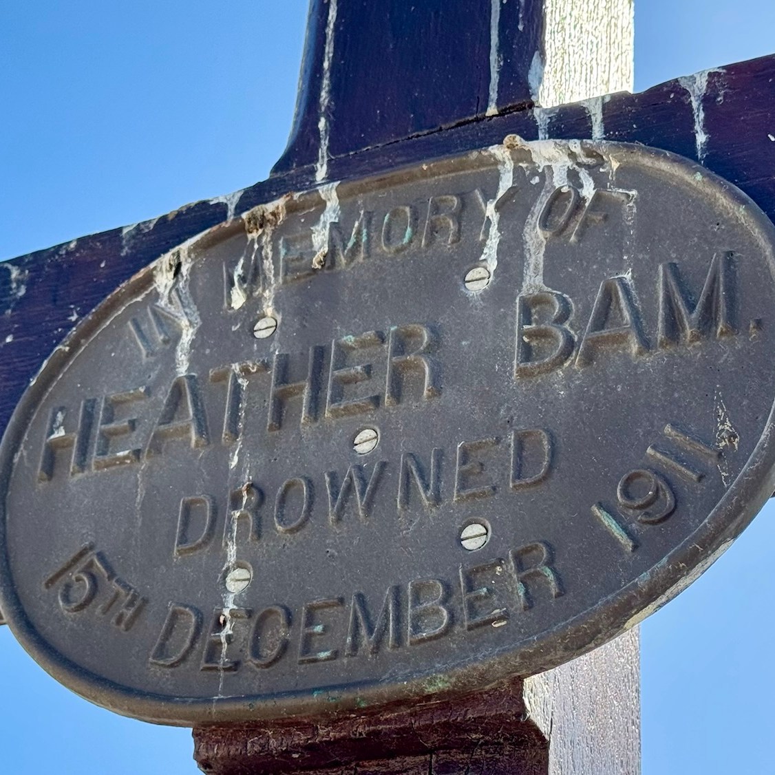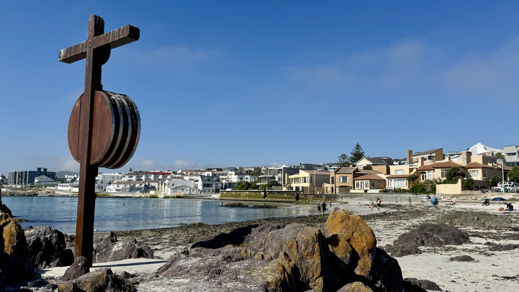 Die Lösung ist ganz einfach. Das „Kreuz“ mit dem Rettungsring steht schon seit vielen Jahrzehnten hier und gehört zum lokalen Kulturerbe. Denn es erinnert an ein Unglück im Jahre 1911. Die damals 20 jährige Heather Bam ertrank am 15. Dezember 1911 an dieser Stelle. Die Station mit dem Rettungsring soll Warnung und zugleich Mahnung sein, die Gefahren des Meeres zu kennen und seine eigenen Fähigkeiten beim Baden gut einzuschätzen. Über Heather Bam ist wenig bekannt, außer dass sie in einem Haus an diesem Strandabschnitt gewohnt hat. Später zog dort eine für ihre Kinderbücher bekannte südafrikanische Schriftstellerin und Grafikerin ein. Mittlerweile existiert das Haus nicht mehr, an seiner Stelle wurde ein Apartmenthaus gebaut.