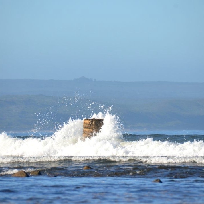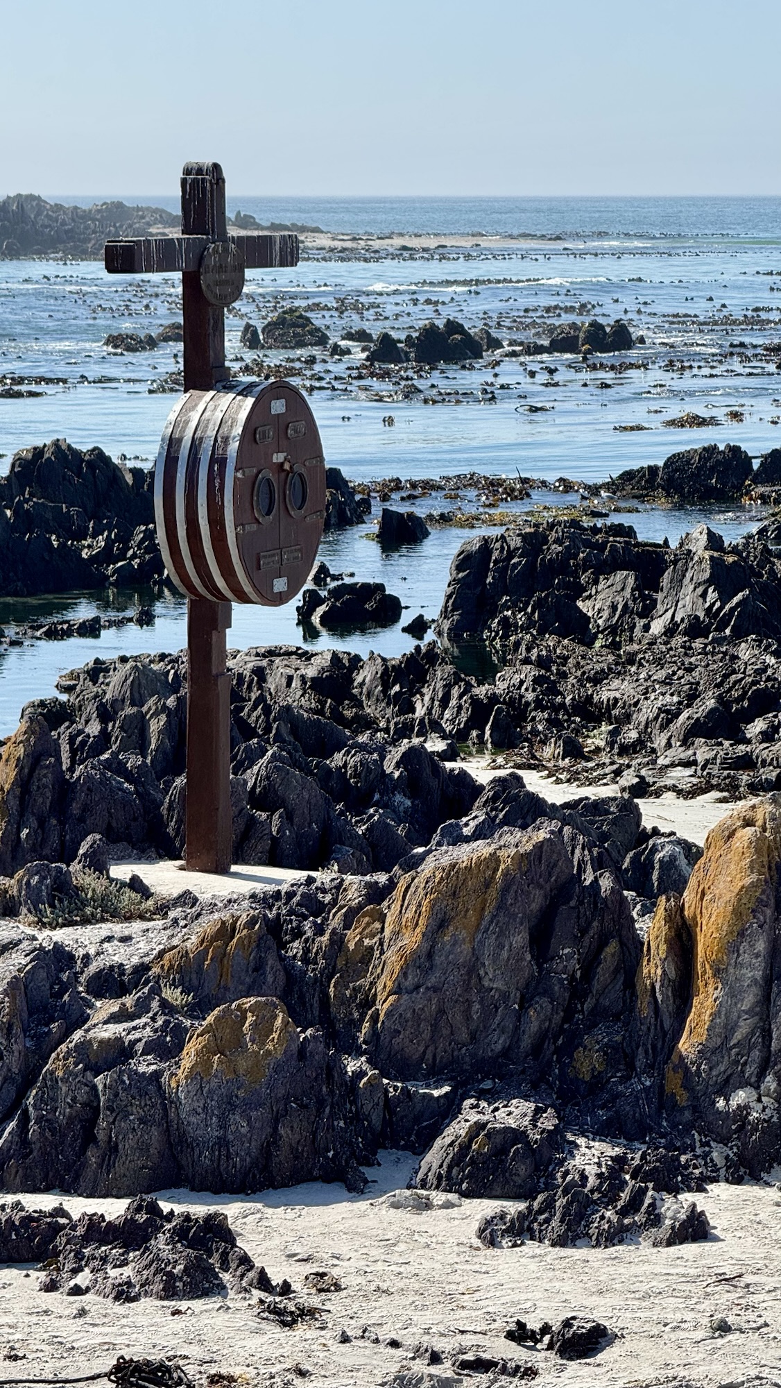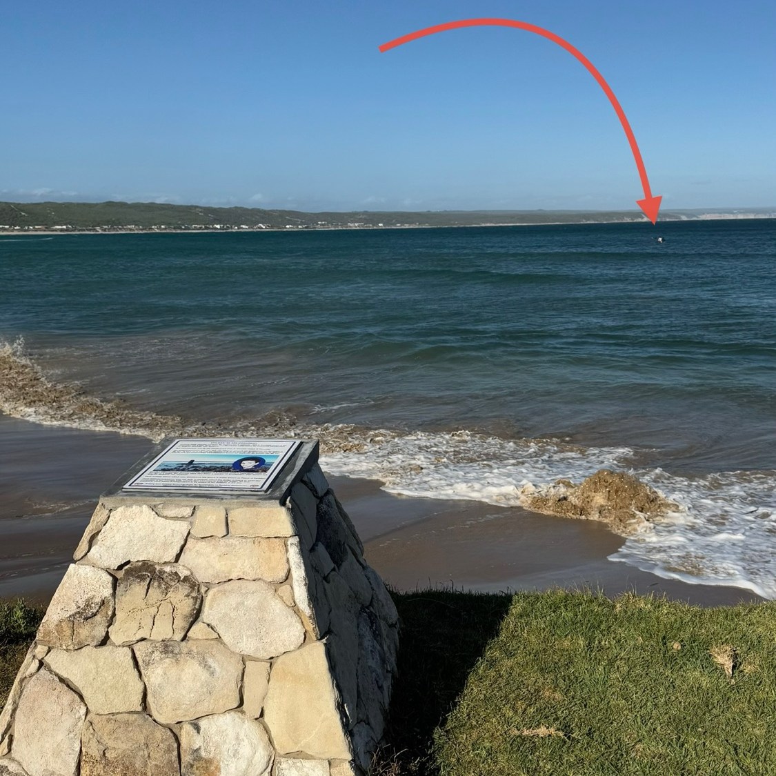 Da wir zu Flut-Zeiten diesen Ort entdeckten, konnten wir das Denkmal nicht wirklich auf einem Foto festhalten. Der rote Pfeil auf einem der Bilder zeigt den obersten Teil der Betonsäule. Das Foto von der wellenumtosten Säule stammt von der Tourismus-Website der Gemeinde Stilbaai.