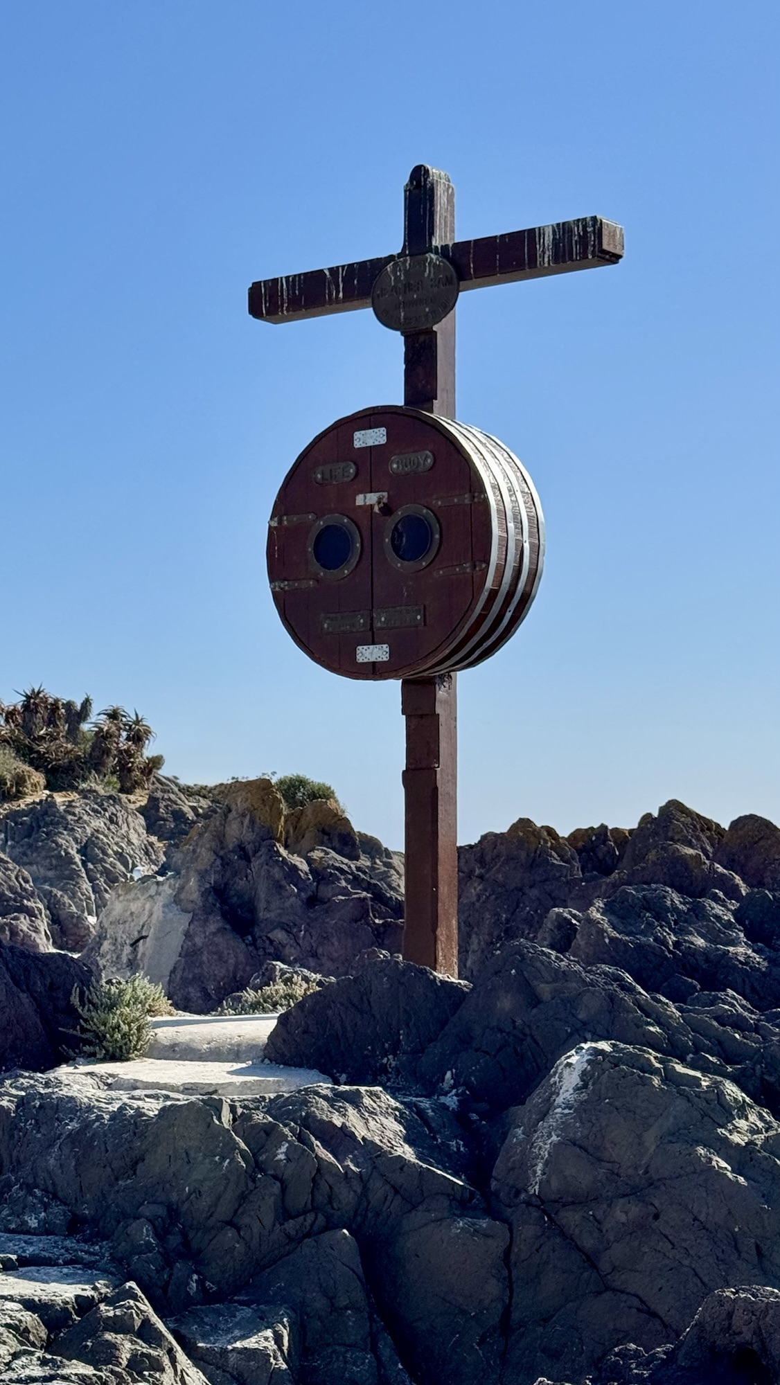 Noch weniger bekannt ist vom Schicksal von Heather Bam. Schon oft haben wir im Restaurant „Ons Huisie“ gegessen und uns über dieses doch recht merkwürdige Kreuz am Strand von Kleinbaai, wie der Ortsteil von Bloubergstrand genannt wird, gewundert. Wie eine Mischung aus Kruzifix und Gespenst aus einem Märchenfilm mit zwei großen Augen steht es dort zwischen den Felsen am Strand.