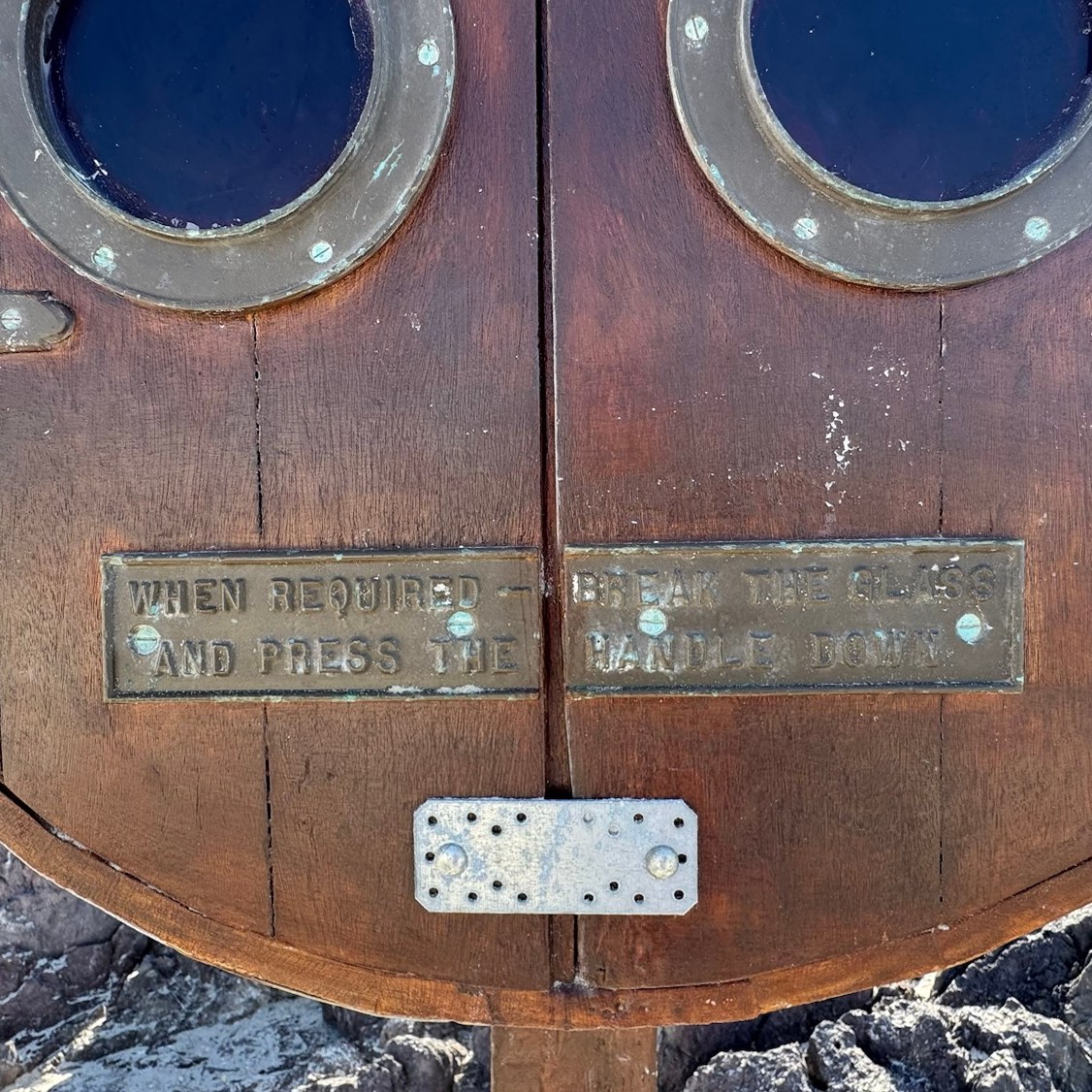 Beim genaueren Hinschauen entpuppt sich dieses Bauwerk als echter Lebensretter. Denn es enthält einen Rettungsring, den man bei Gefahr entnehmen und jemanden vor dem Ertrinken retten kann. Auf dem runden Holzkörper steht der Hinweis, dass man die Glasaugen einschlagen und einen Hebel betätigen soll, damit sich die Klappe öffnet und der Rettungsring zugänglich wird. Eine Sirene soll auch im Inneren zu finden sein, damit man weitere Menschen als Retter rufen kann. Soweit so gut. Aber warum sieht diese Halterung so ganz anders aus also die normalen Rettungsstationen, die an den Stränden sonst verteilt zu sehen sind?