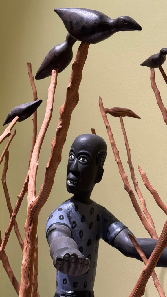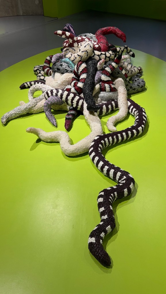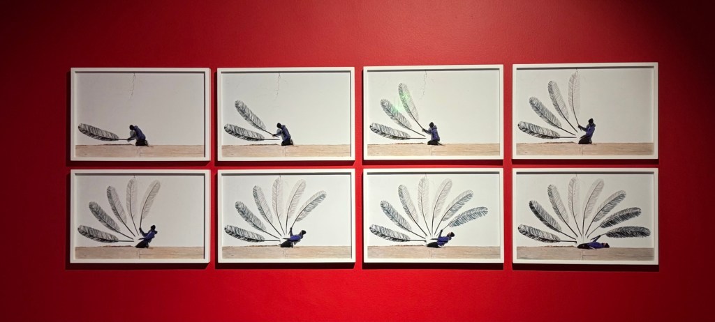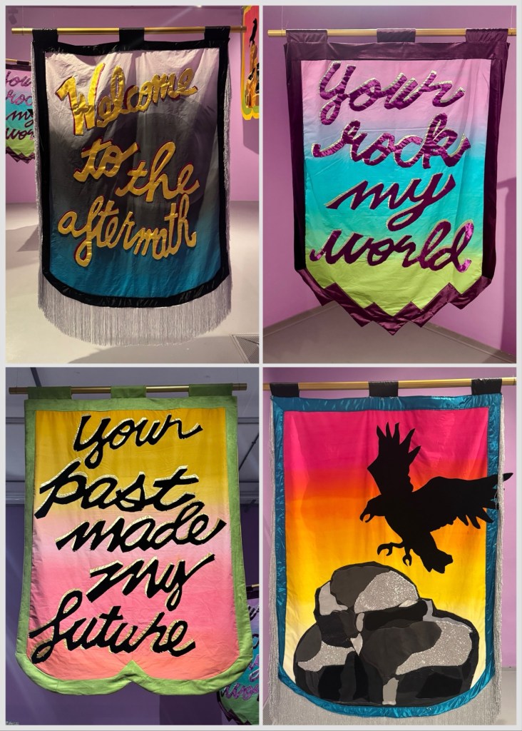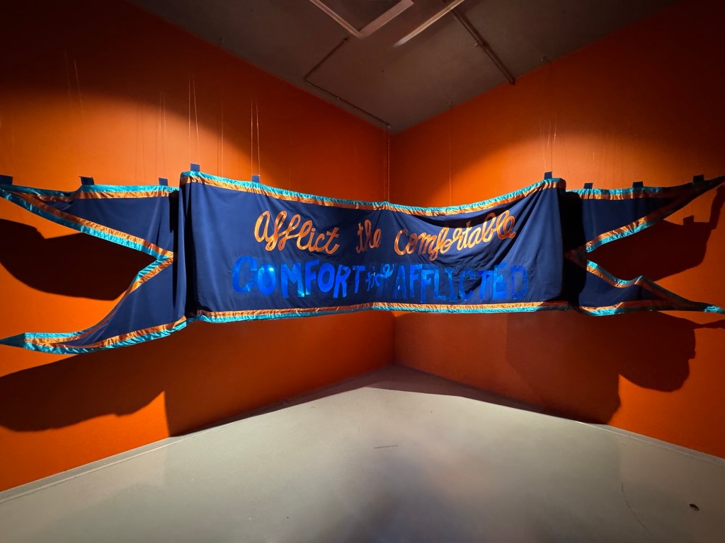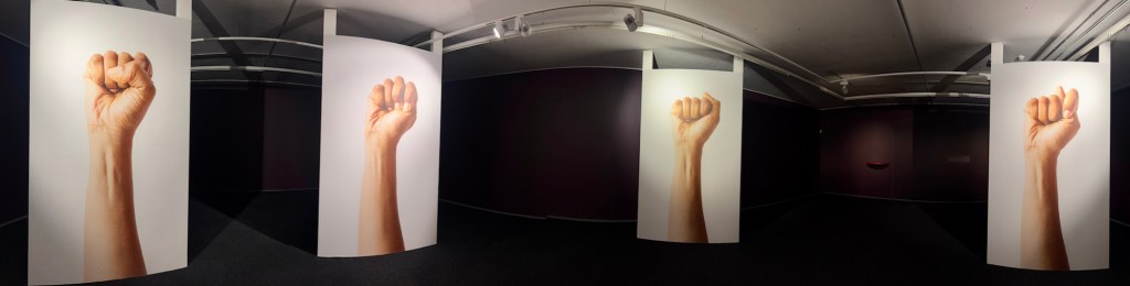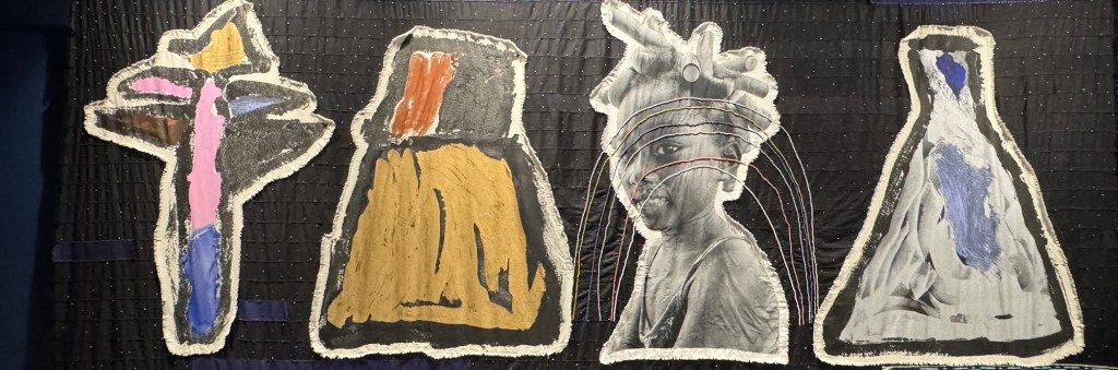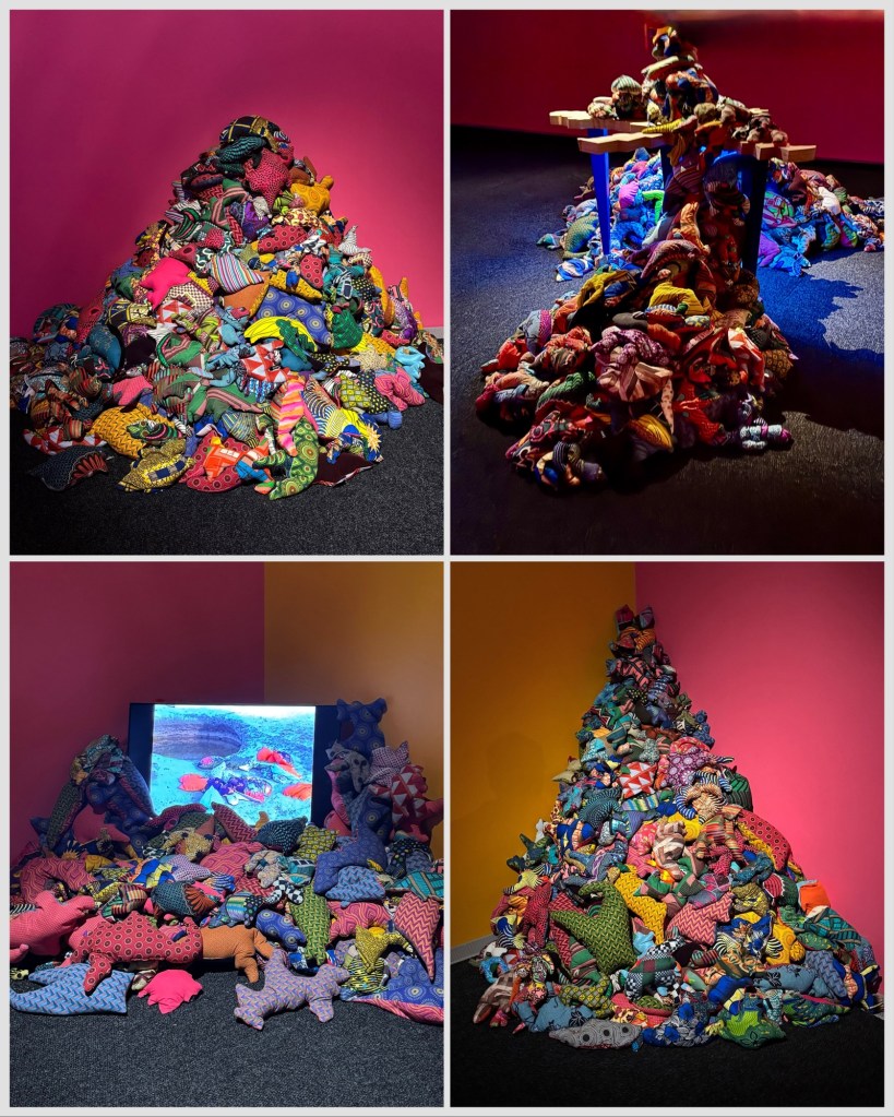 Diese Ausstellung die in etwa mit “Mach es den Bequemen unbequem, tröste die Leidenden” übersetzt werden kann, stammt von Cauleen Smith. Sie lebt in Los Angeles und stellt zum ersten Mal auf dem afrikanischen Kontinent hier im MOCCA aus. Sie arbeitet mit unterschiedlichen Materialien und Installationen und erzählt damit Geschichten über das Leben schwarzer Gemeinschaften. Feminismus, Spiritualität, Musik und eine gerechtere Welt spiegeln sich in ihren Werken wider. Die Ausstellung soll zum Nachdenken über das gemeinschaftliche Leben anregen, auch sich gegenseitig zuzuhören, miteinander in den Dialog zu kommen und am Ende miteinander zu träumen, was möglich ist. Seht ein paar ihrer Werke auf den nächsten Bildern: