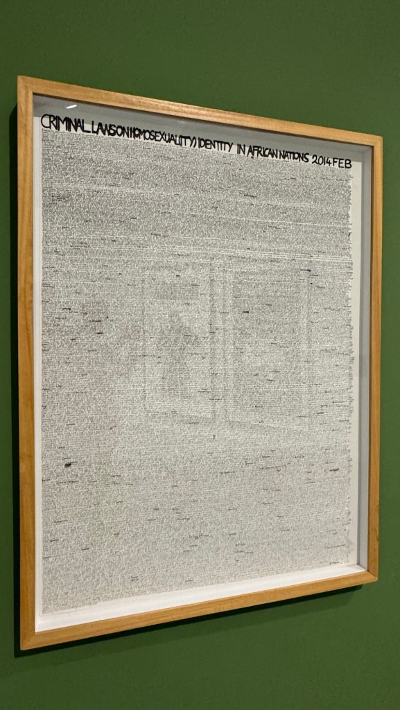 Einen besonderen Blick wert sind die Kunstwerke von Brett Charles Seiler, gleich die ersten beiden Bilder in der folgenden Serie zeigen sie. Robert Mugabe, ehemaliger Präsident von Simbabwe behauptete 2015 vor UN, dass „wir keine Schwulen sind!“ Im Jahr zuvor hat der Simbabwe-Künstler Brett Seiler zwei subversiv, queere Flaggen der Nation erstellt. Er verschmolz die regenbogengestreifte LGBTQ+-Pride-Flagge mit dem ikonischen goldenen Vogel, dem roten Stern und dem weißen Dreieck der Simbabwe-Flagge. Dann bleichte er alle Farben und schuf ein Paar unheimlich monochromatischer Objekte, die in einem X montiert sind. Dies drückte seine Trauer um den Verlust der Rechte für queere Menschen unter einem gewalttätig homophoben politischen Regime aus. Simbabwe ist dabei nicht das einzige Land in Afrika, das derartig diskriminiert, was Seilers in einer Textarbeit deutlich macht. Die handschriftlichen Zeilen erinnern an eine Schulstrafe und seine eigenen jugendlichen, diskriminierenden Erfahrungen. Er schrieb alle Länder Afrikas und die Gesetz jeder Nation viermal auf, die Homosexualität kriminalisieren. Seht selbst …