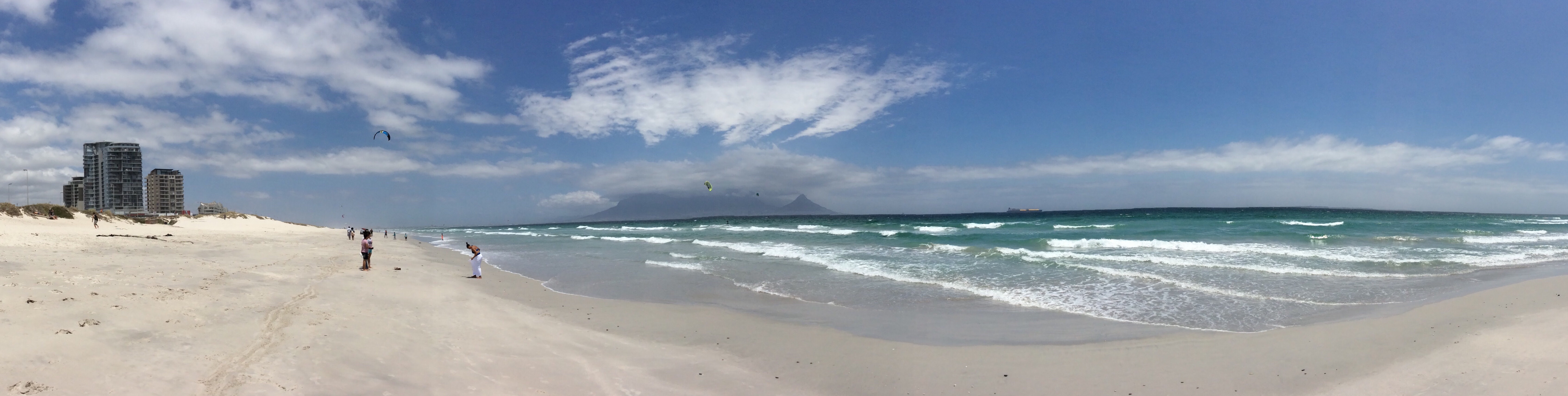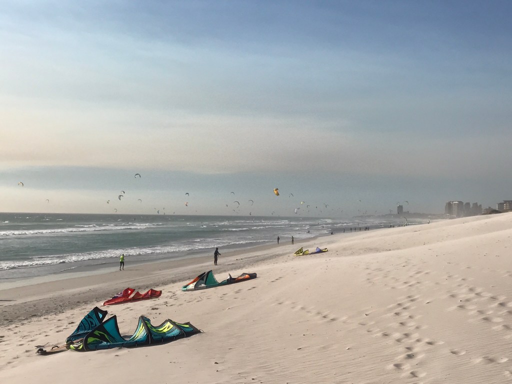 Kapstadt schönste Seite – Bloubergstrand. Von hier aus hat man den klassischen Postkarten-Blick auf den Tafelberg, einen ziemlich wilden und kühlen Atlantik mit einem breiten und kilometerlangen Strand und noch mehr Kitern, die durch die Wellen pflügen und den Himmel erstürmen.