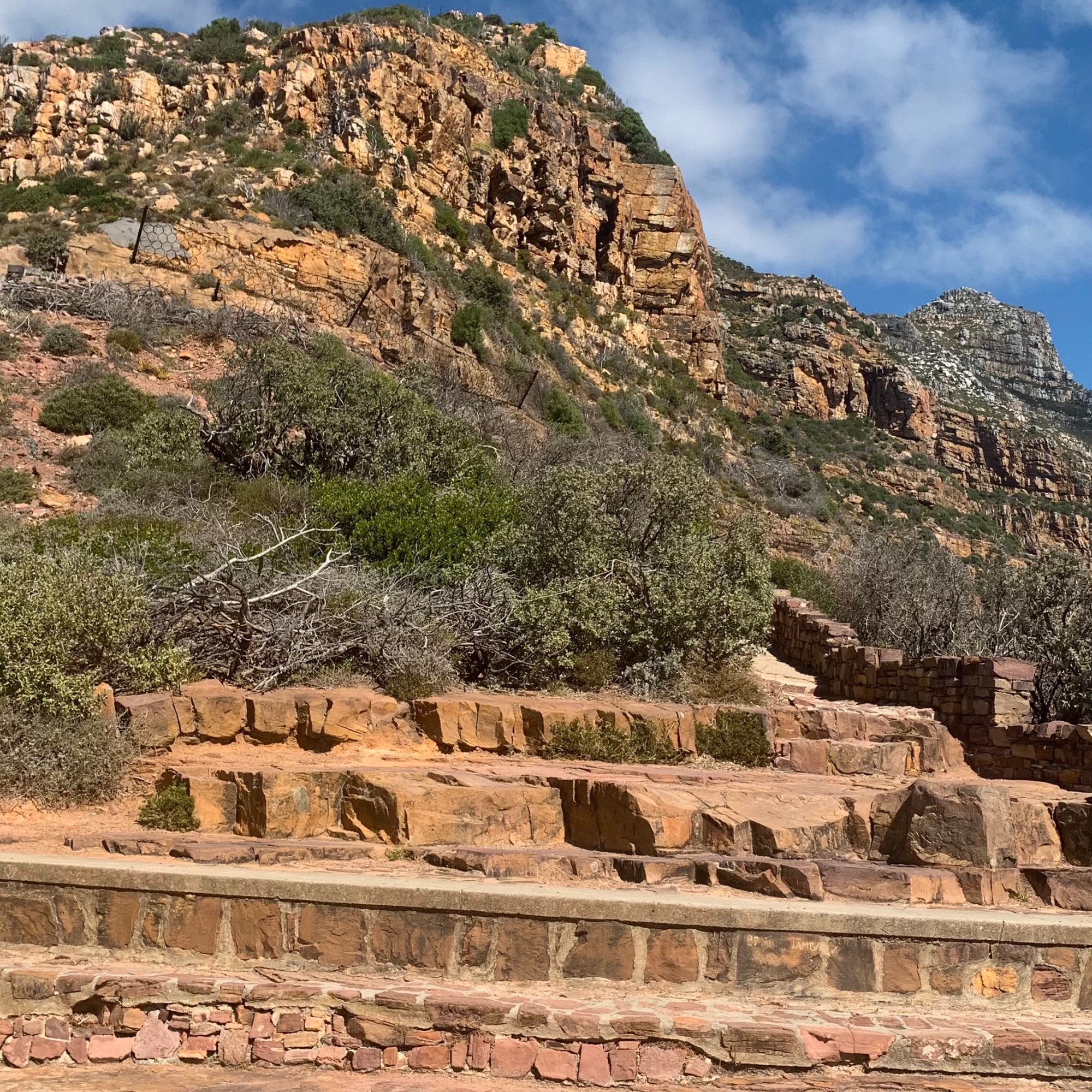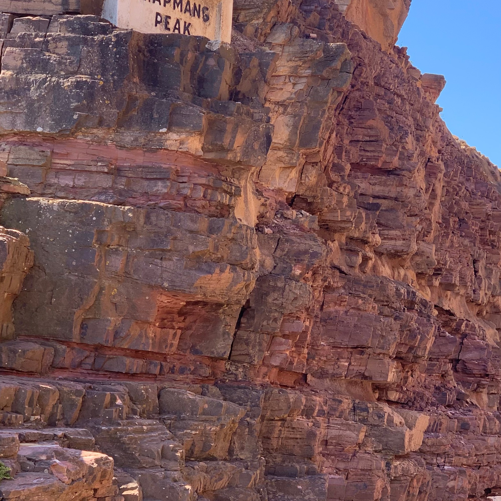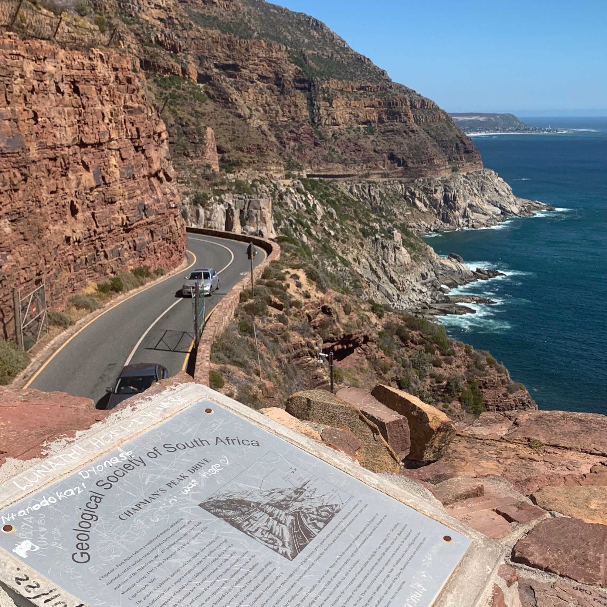 An der höchsten Stelle des Drives erreicht man den Chapman’s Peak, einen Aussichtsfels, von dem man einen Rundum-Blick über Bucht und Küstenstraße hat. Die Straße ist übrigens benannt nach einem Mann der Besatzung des englischen Schiffes Consent, das 1607 das Kap der guten Hoffnung umrundete. Der Kapitän des Schiffes schickt John Chapman an Land, um Vorräte für die Weiterreise zu suchen, was ihm auch gelang. Aus Dankbarkeit benannte der Käpt‘n die Bucht nach seinem Essensbeschaffer Chapman’s Chance. Im Laufe der Jahrhunderte wurde die Bucht nach dem Ort Hout Bay benannt, der Gipfel behielt aber seinen Namen.