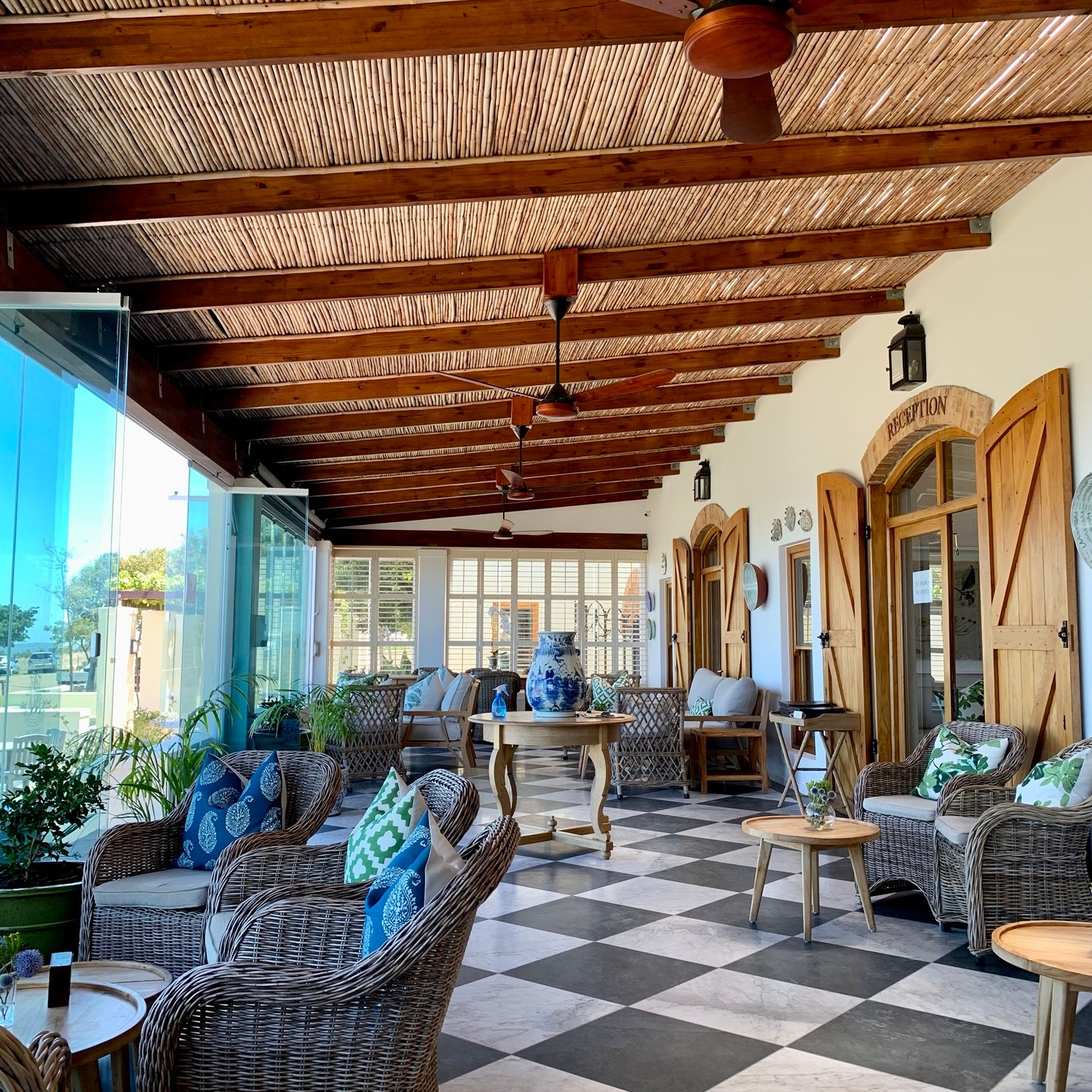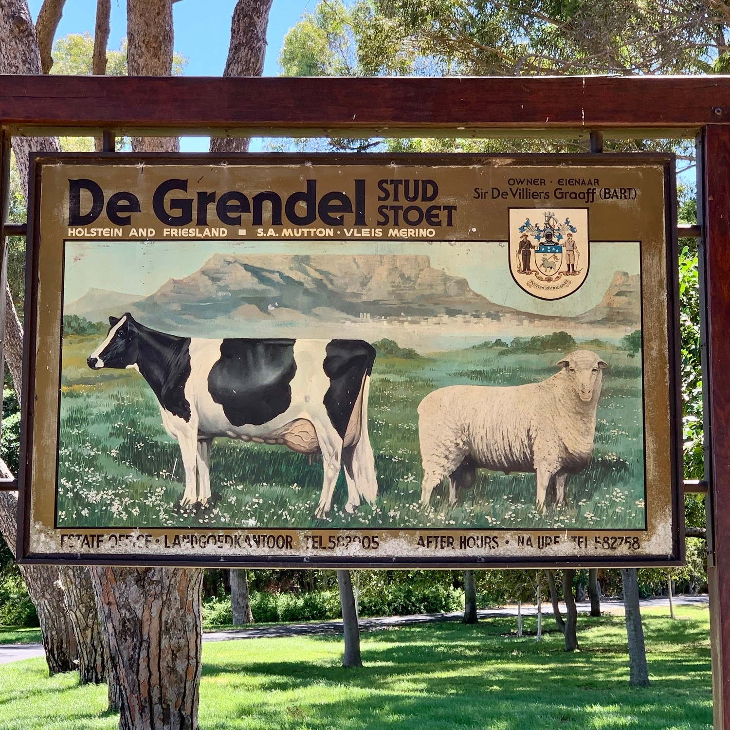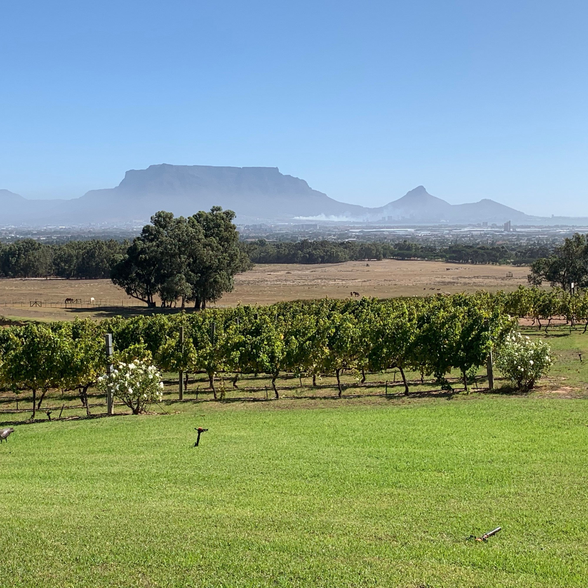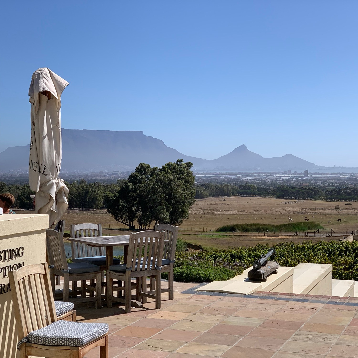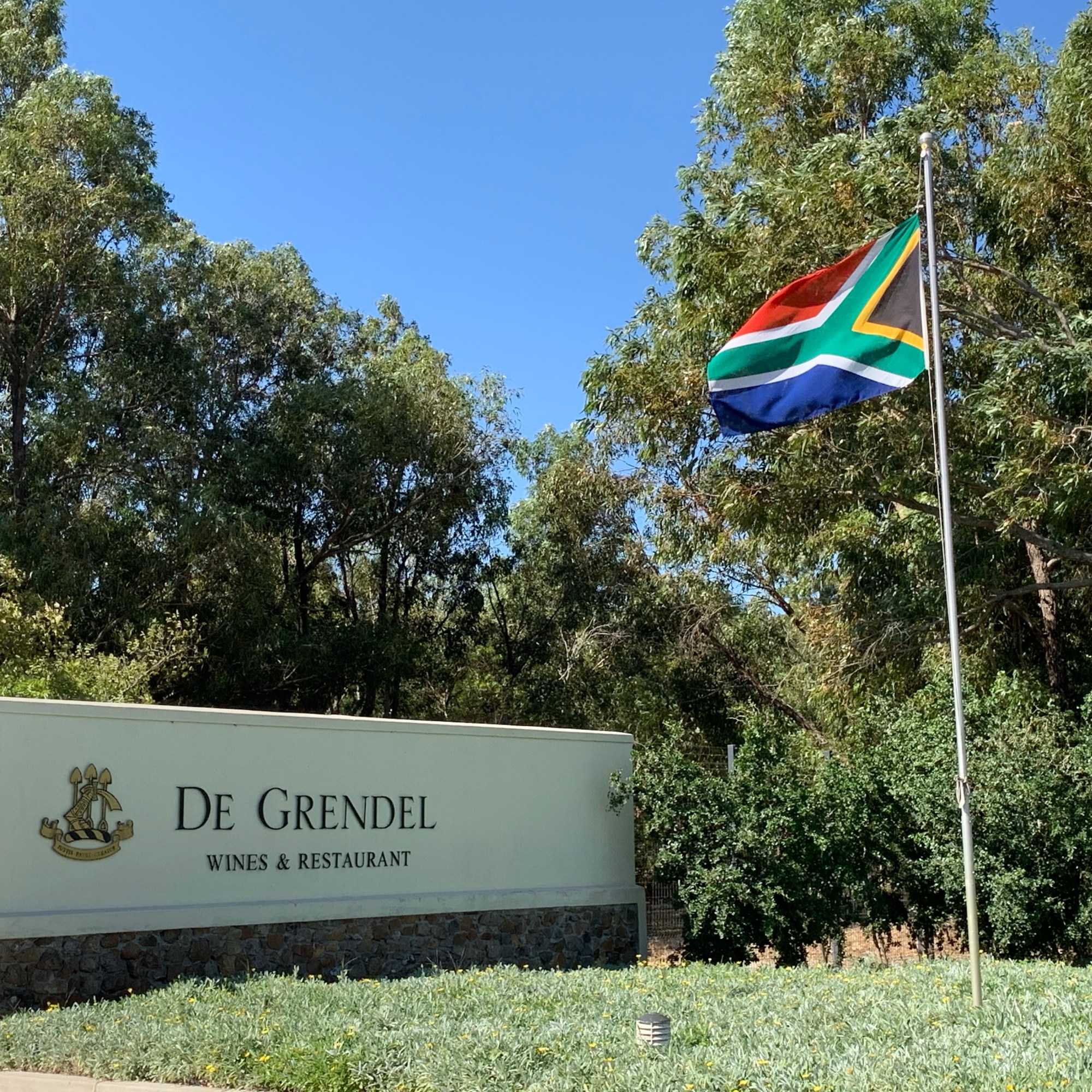 Das südlichste Weingut des Durbanville Wine Valley heißt De Grendel und existiert als Farm bereits seit 1720 unter diesem Namen. Die Anreise dorthin ist wenig aufregend. Man fährt von Bloubergstrand aus auf einigermaßen belebten Straßen durch Industriegebiete, vorbei an einem großen Tanklager bis man dann vor der Einfahrt zum Weingut steht. Und wird dann sofort belohnt von Ruhe, weiten Feldern und einem befestigten Weg hoch zum Gutshaus und zum Restaurant. Plötzlich hat man einen selten guten Blick auf die gesamte Stadt und natürlich auf den Tafelberg. Absolut einmalig.
