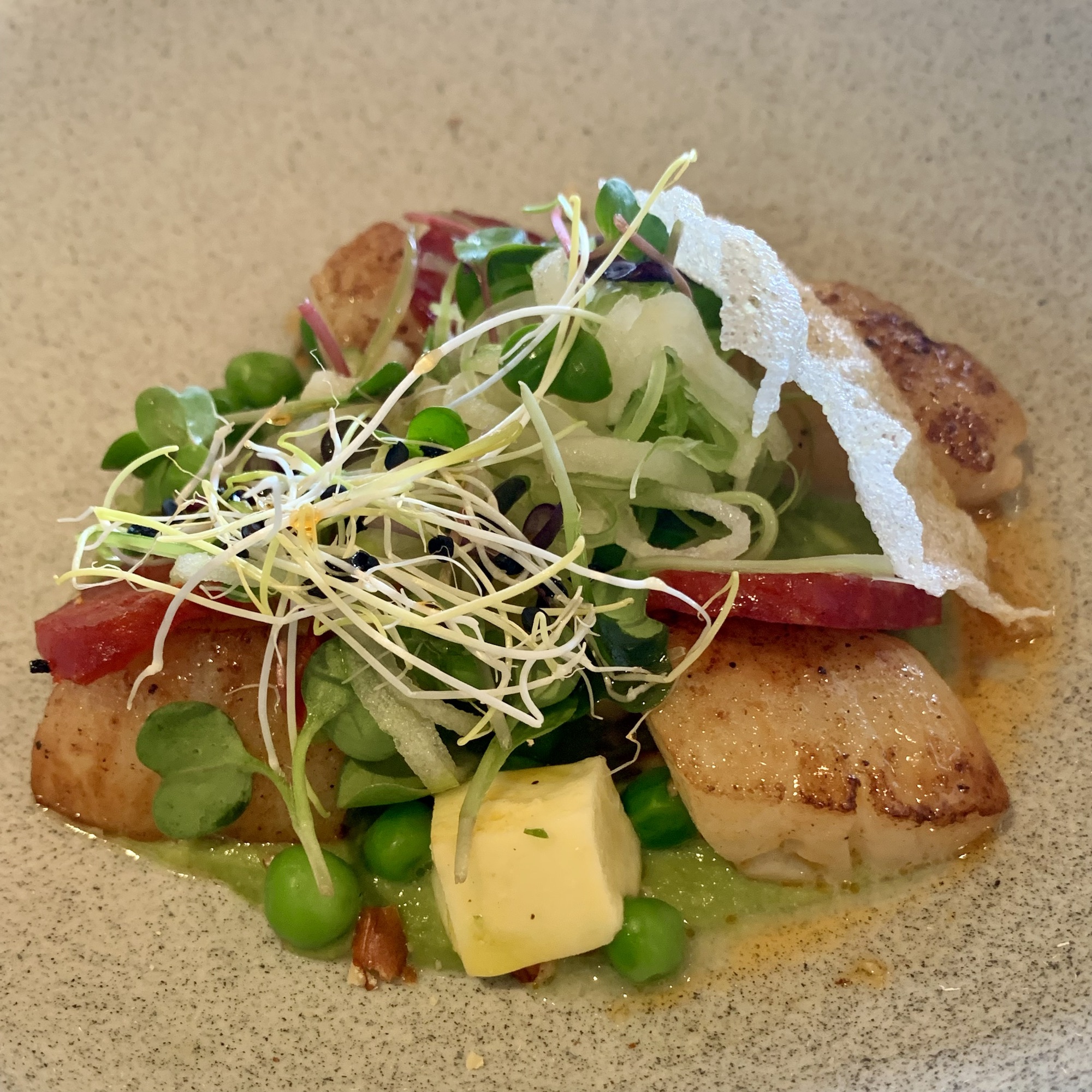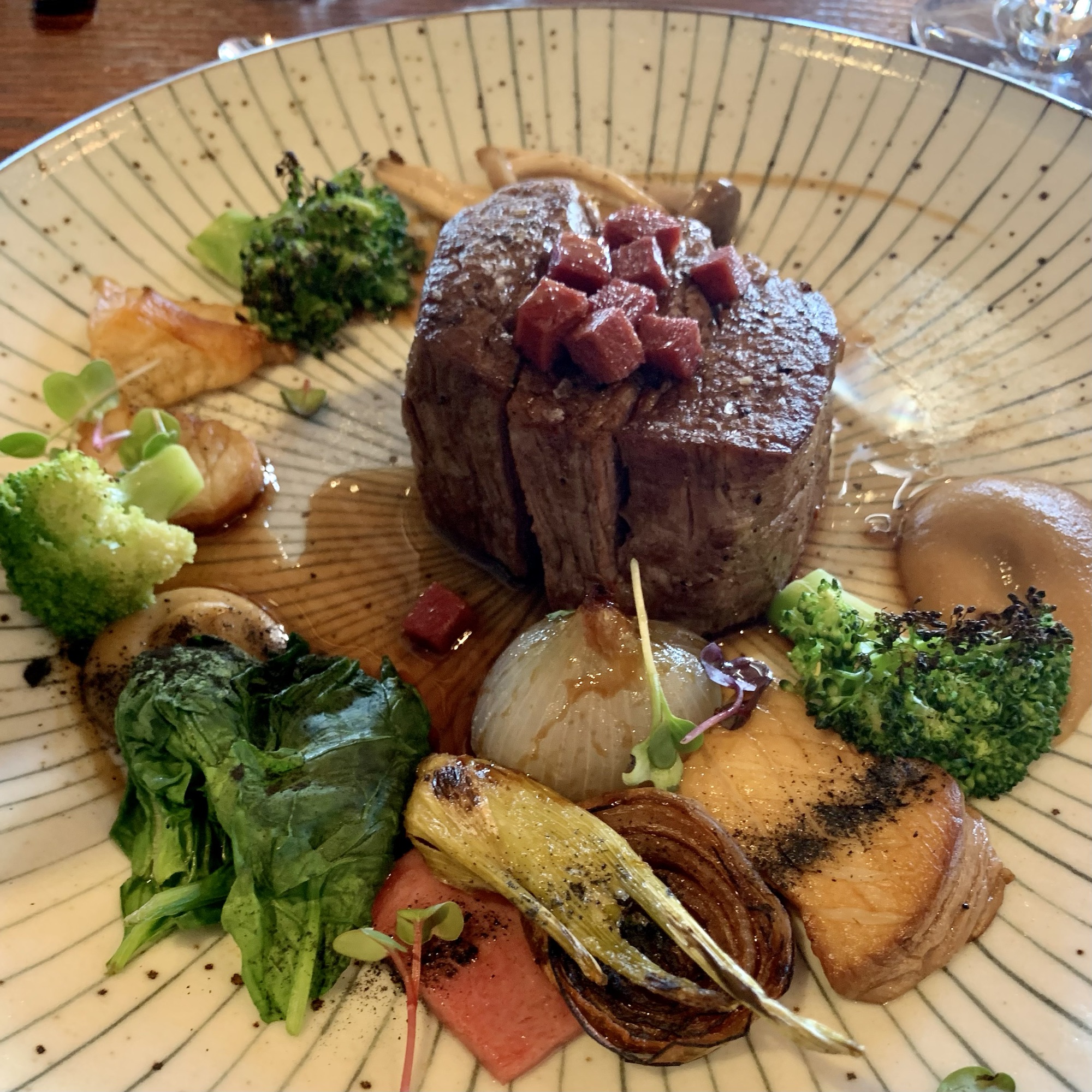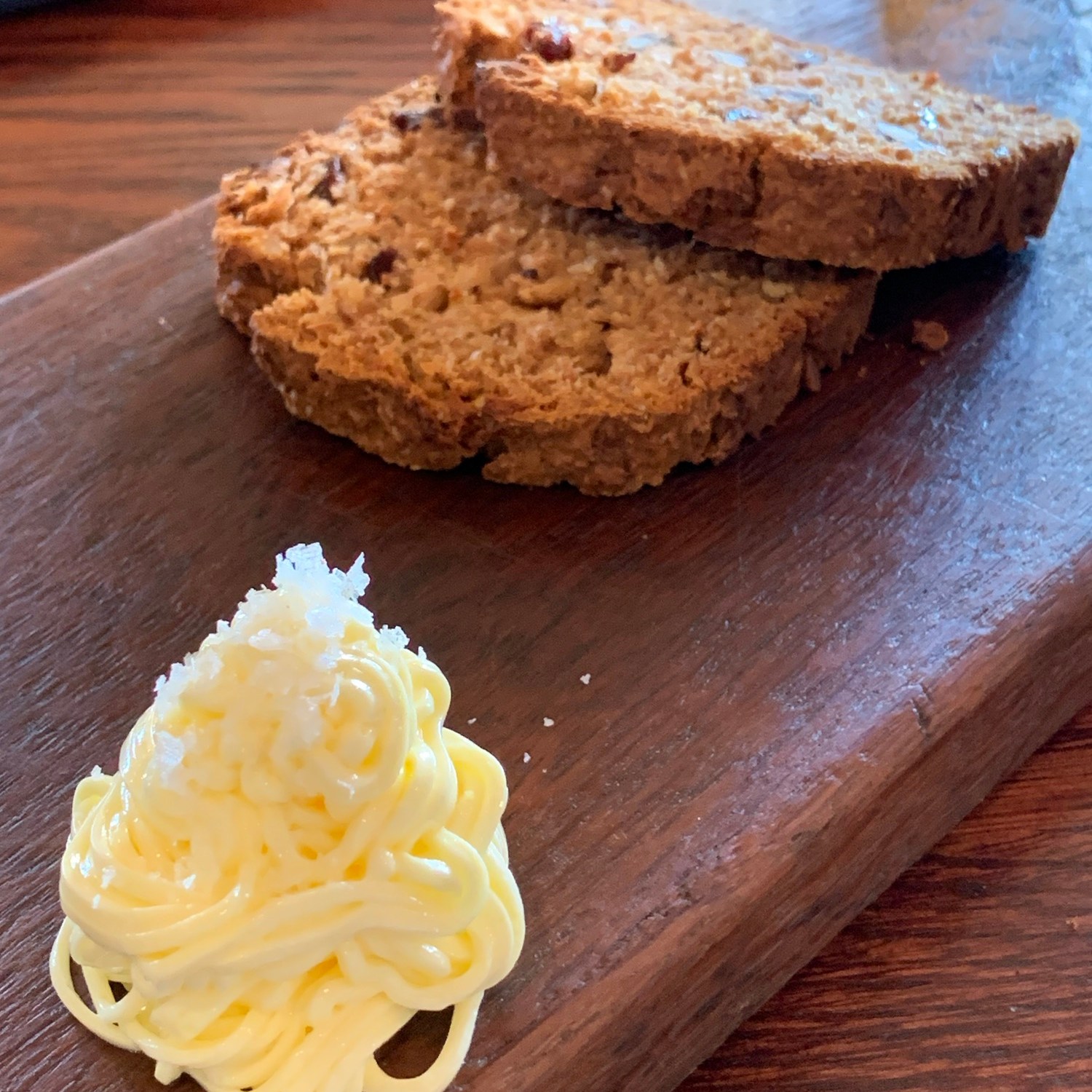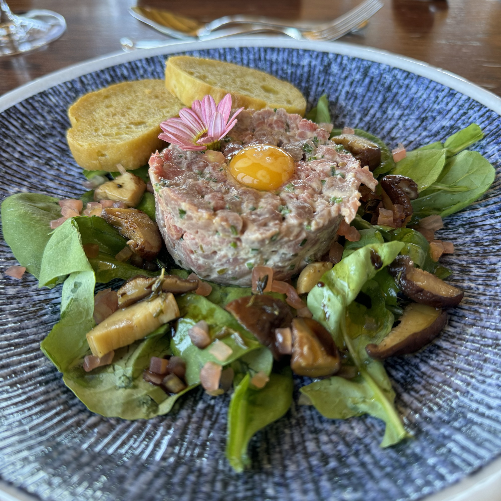 Je nach Hunger und Appetit kann man aus einem Zwei- oder Drei-Gänge-Menü wählen. Wer Lust hat nimmt die Weinbegleitung mit dazu. Vorab gibts den üblichen Gruß aus der Küche und selbstgebackenes, extrem leckeres Brot.