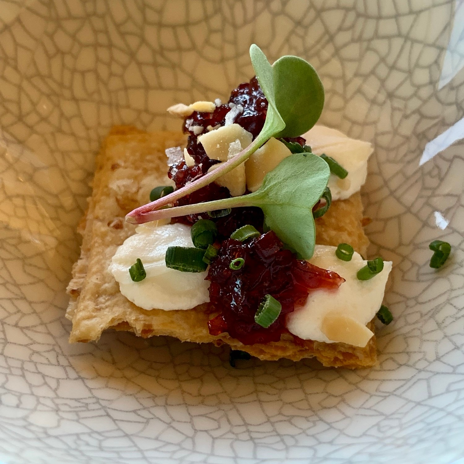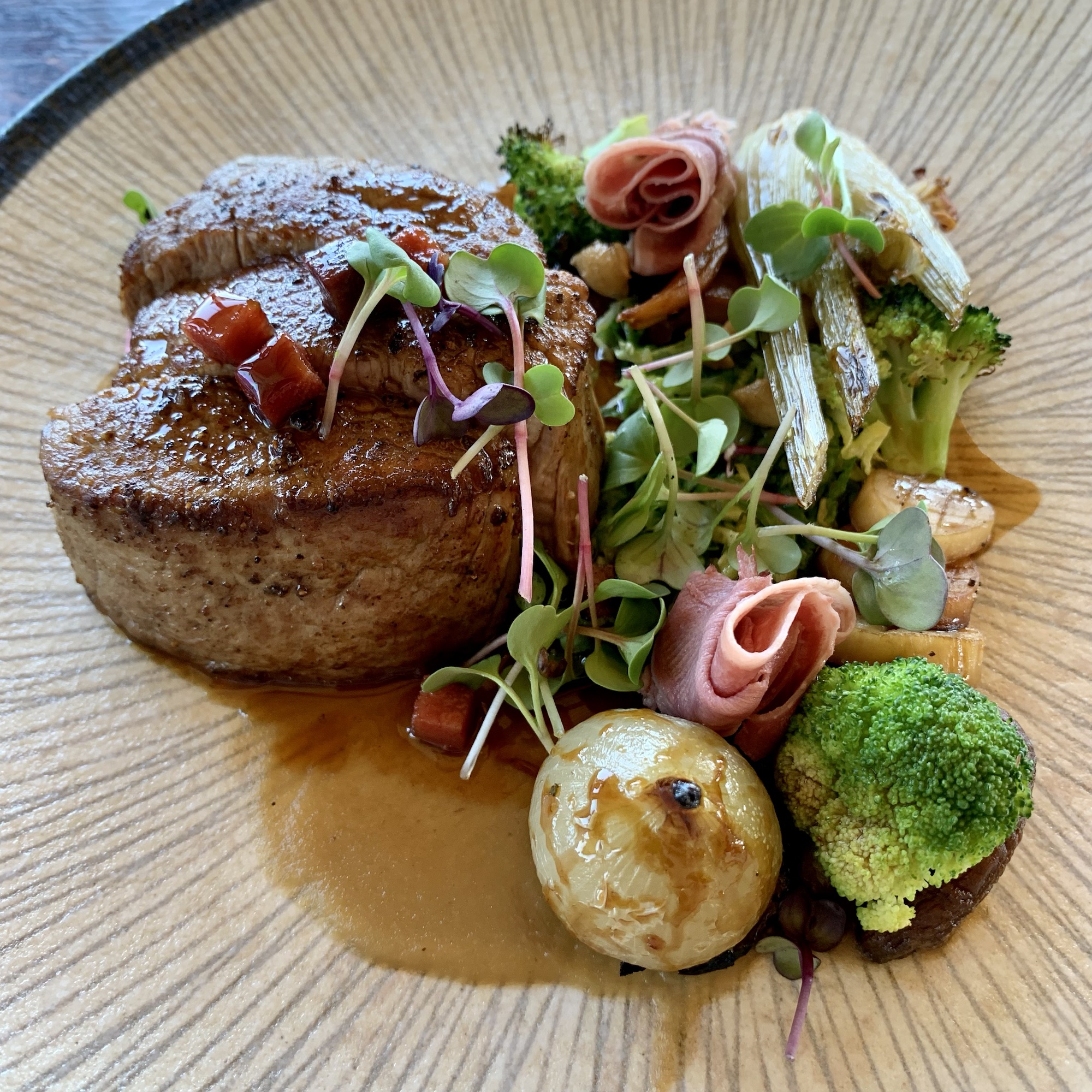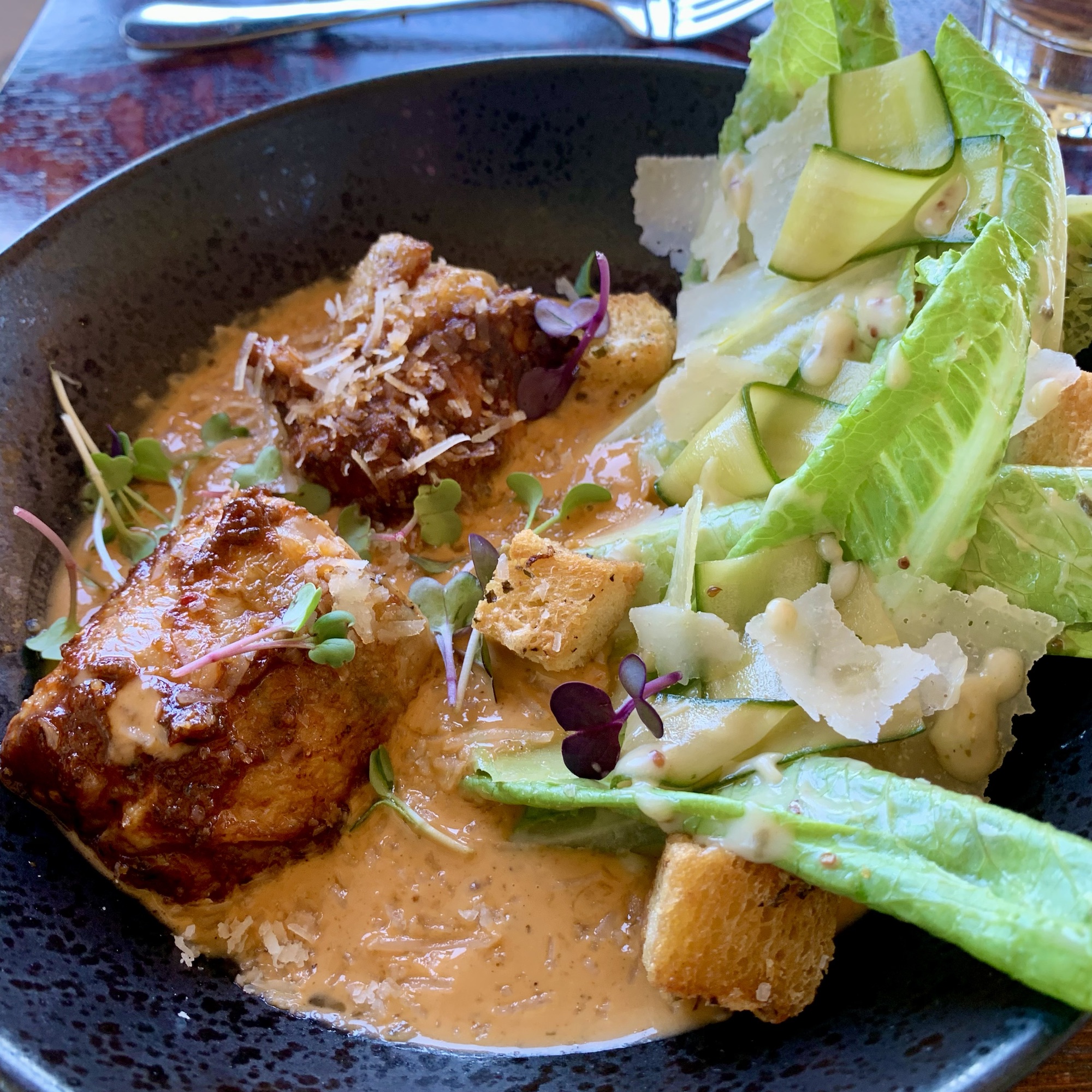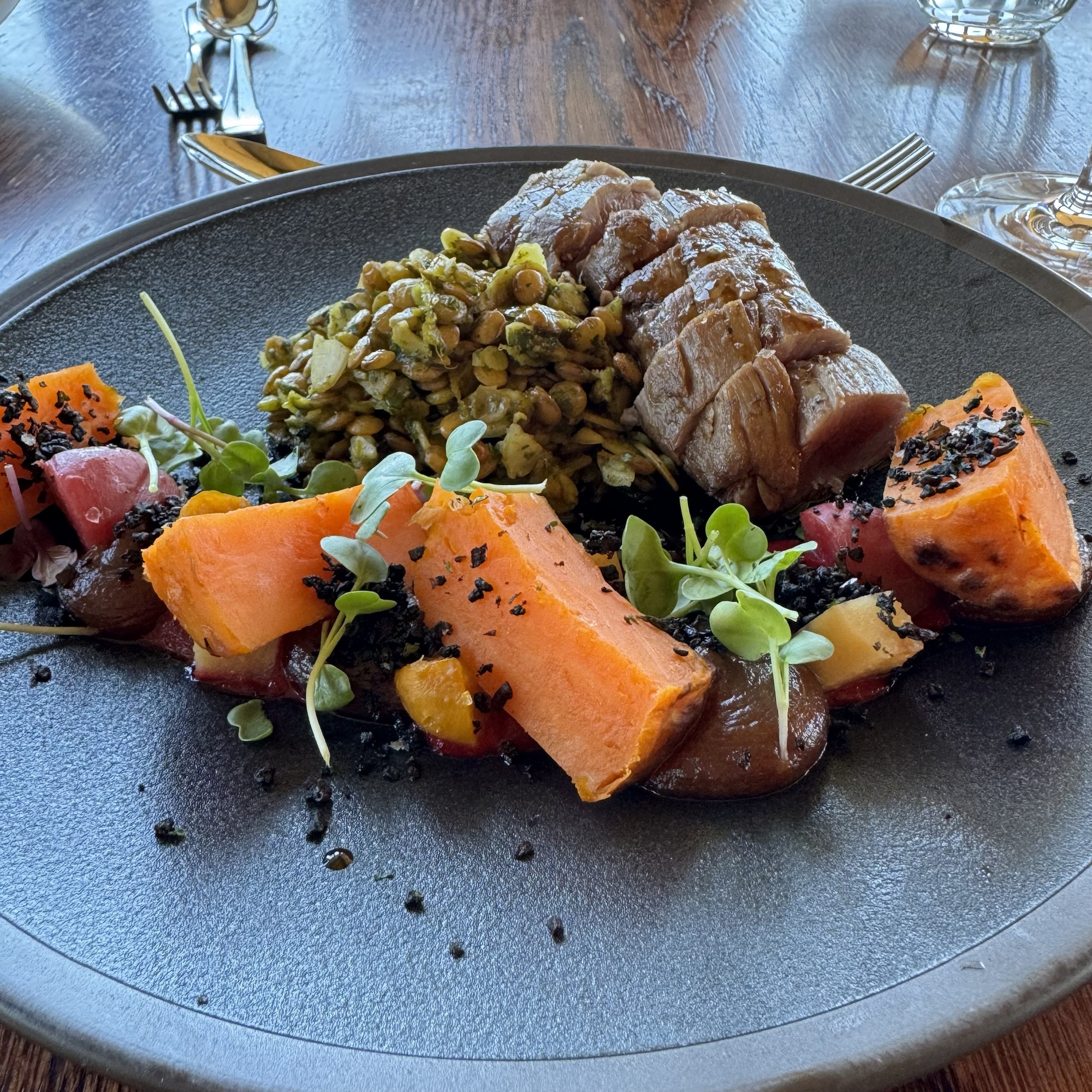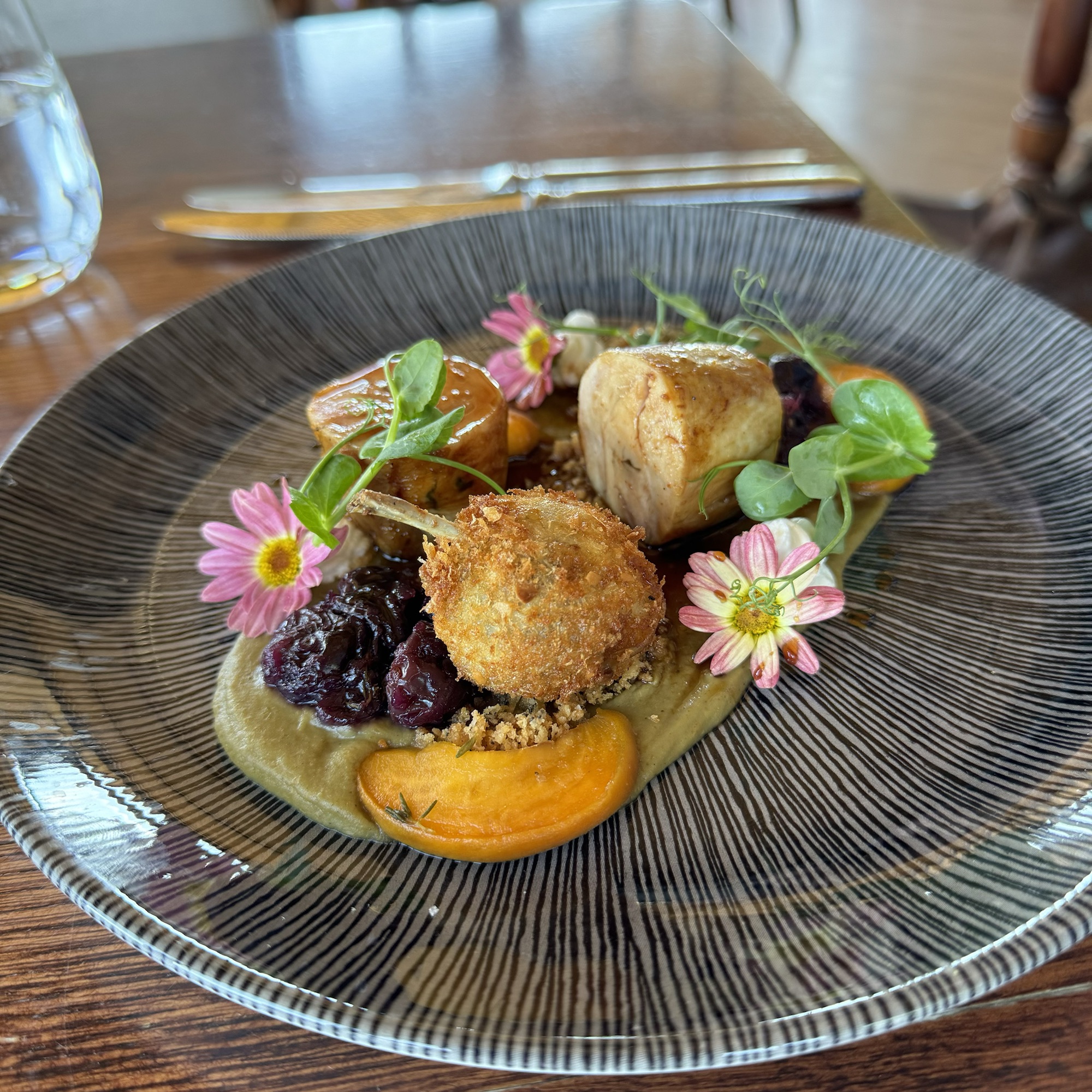 Je nach Hunger und Appetit kann man aus einem Zwei- oder Drei-Gänge-Menü wählen. Wer Lust hat nimmt die Weinbegleitung mit dazu. Vorab gibts den üblichen Gruß aus der Küche und selbstgebackenes, extrem leckeres Brot.