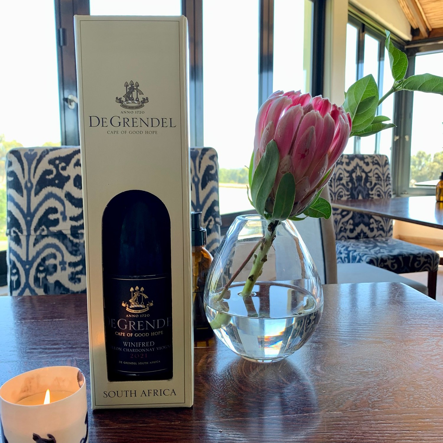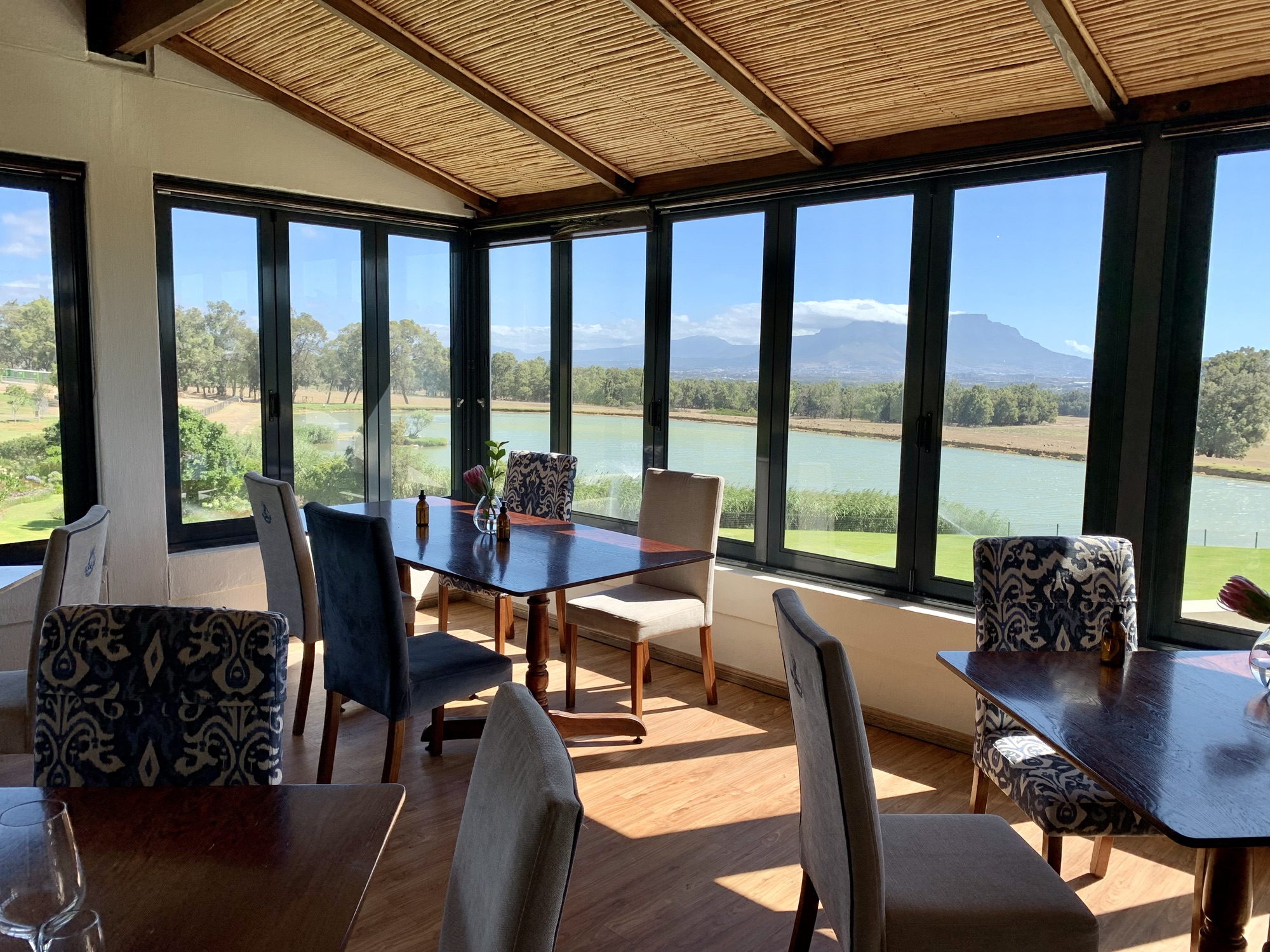 Auto abstellen, schnell erst einmal ein paar Fotos machen und dann hinein ins Haupthaus. Darin befindet sich fast alles, was man erwarten würde: eine Tasting-Terrasse, ein Restaurant und der Weinkeller mit Produktionsstätte. Das Wine-Tasting kann man wahlweise im Haus bei großen, geöffneten Fenstern oder ganz draußen auf der Terrasse genießen, beides mit Blick auf den Tafelberg. Entscheidet man sich für eine Weinprobe, kann man aus unterschiedlichen Tastings auswählen. Die Sommeliers helfen gern bei der Auswahl. Selbst, wenn die Zusammenstellung der Weine auf die persönlichen Vorlieben nicht ganz passt, machen sie einen individuellen Vorschlag, damit die Weinprobe zu einem Erlebnis wird. Wir können nur Weißweine und Rosés vertragen und lassen auch immer den MCC weg, also den „Sekt“, der in Südafrika „Methode Cap Classique“ heißt. Eine alternative Auswahl ist hier bei De Grendel und in den meisten Weingütern kein Problem. Im Zweifel wird lediglich der Preis für Tasting angepasst.