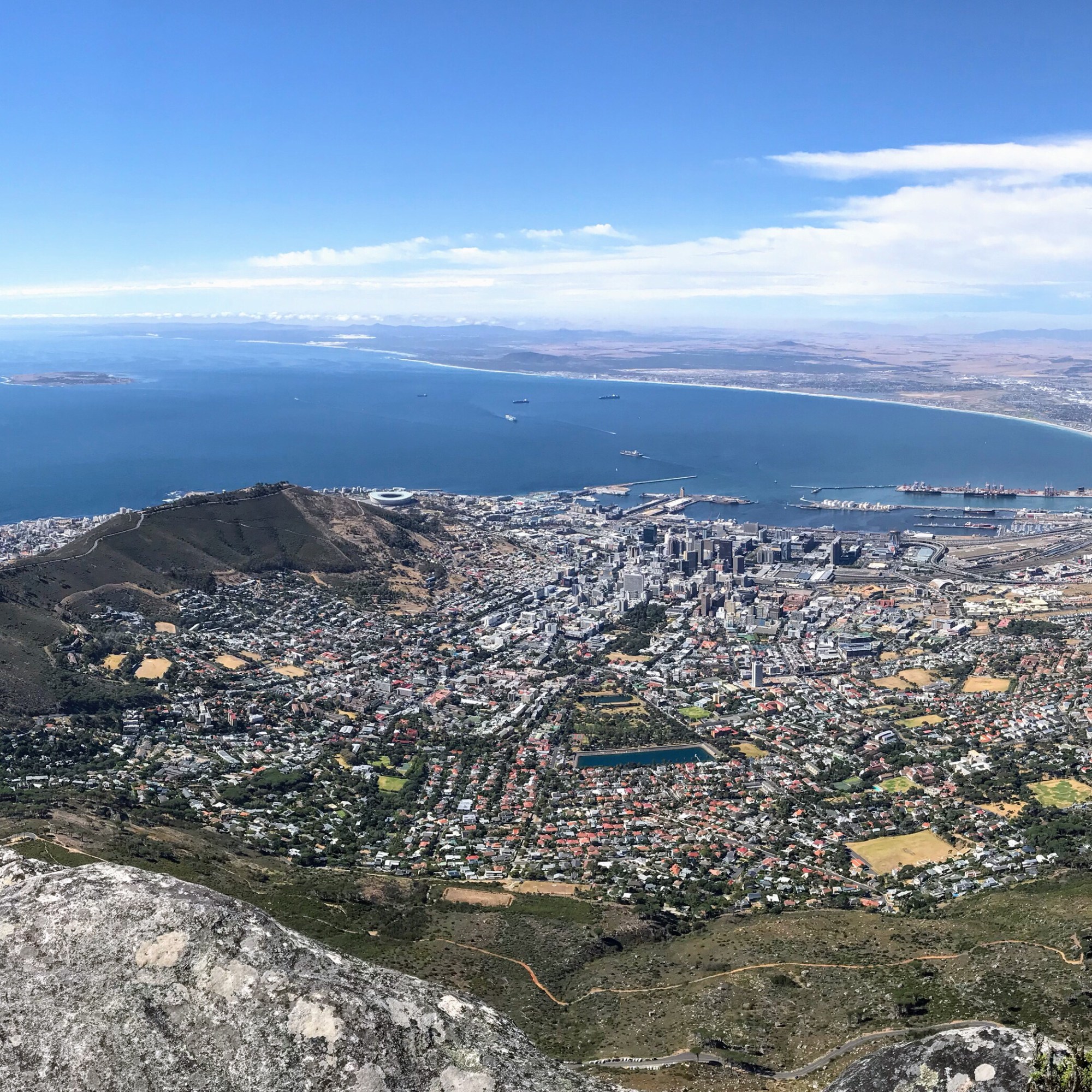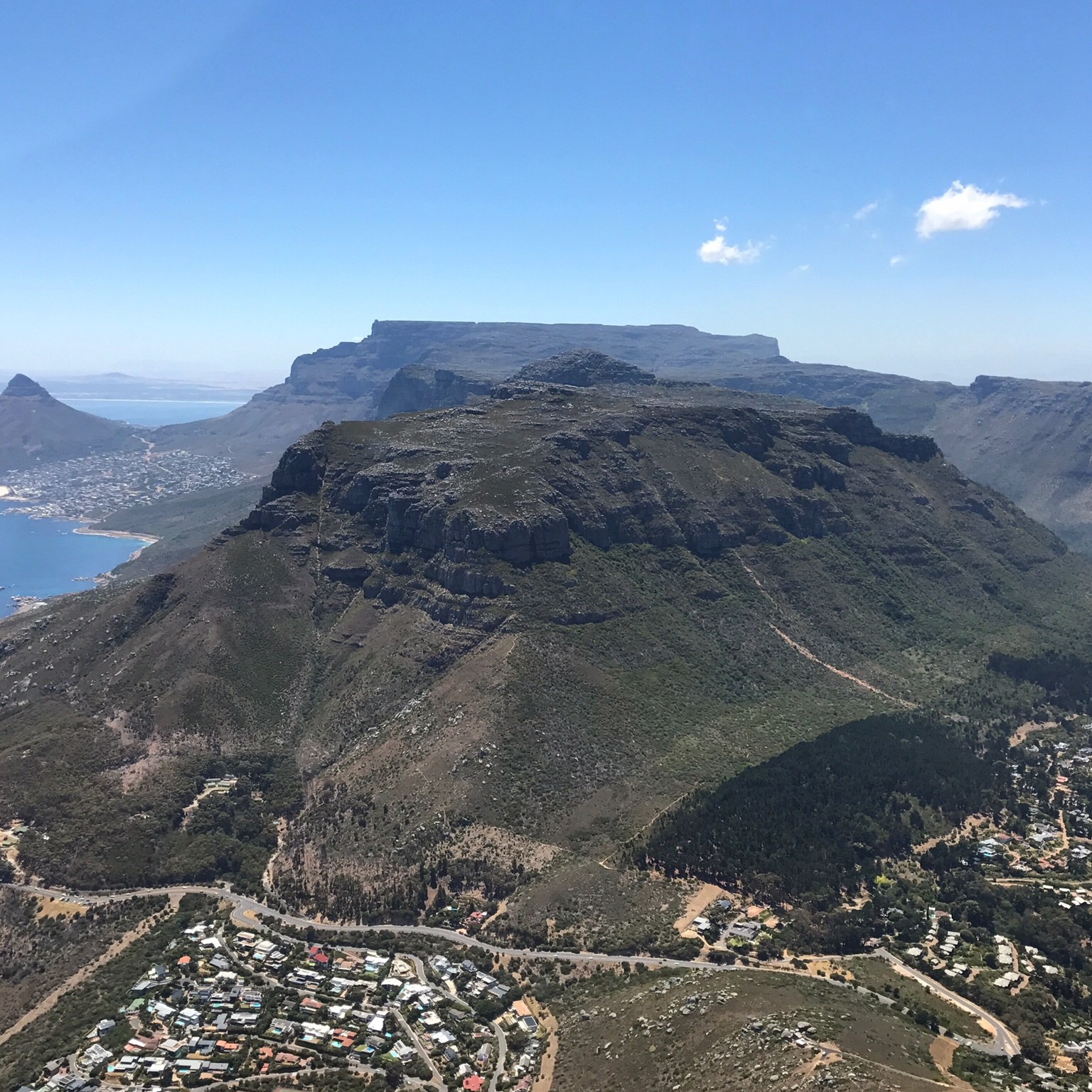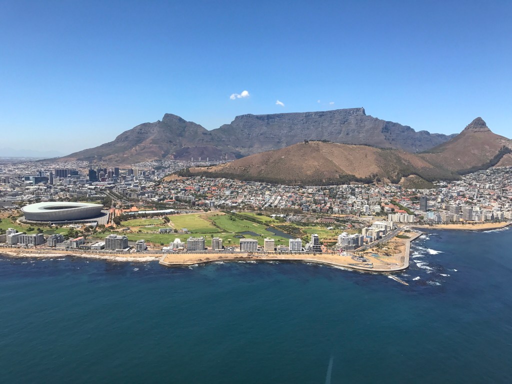 Der Tafelberg bestimmt das Gesicht der Stadt, er beeindruckt durch seine majestätische Schlichtheit, manchmal oder auch öfter von Wolken bedeckt, dem so genannten Tischtuch. Das Leben spielt sich um den Berg herum ab, schmiegt sich die Stadt doch wie ein Kragen vom Wasser aus an den rund 1000 Meter hohen Fels. Links und rechts begrenzt vom „Devils Peak“, vom „Lions Head“ und „Signal Hill“, um die es zahlreiche Sagen gibt, zieht beginnend mit den „12 Aposteln“ eine Bergkette bis zum Cape Point und zum Kap der Guten Hoffnung.