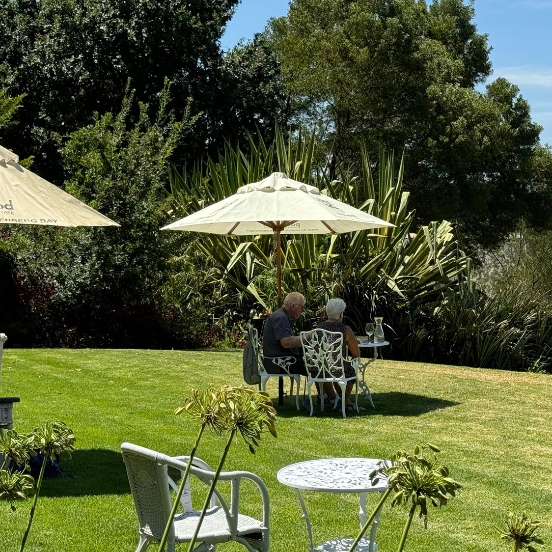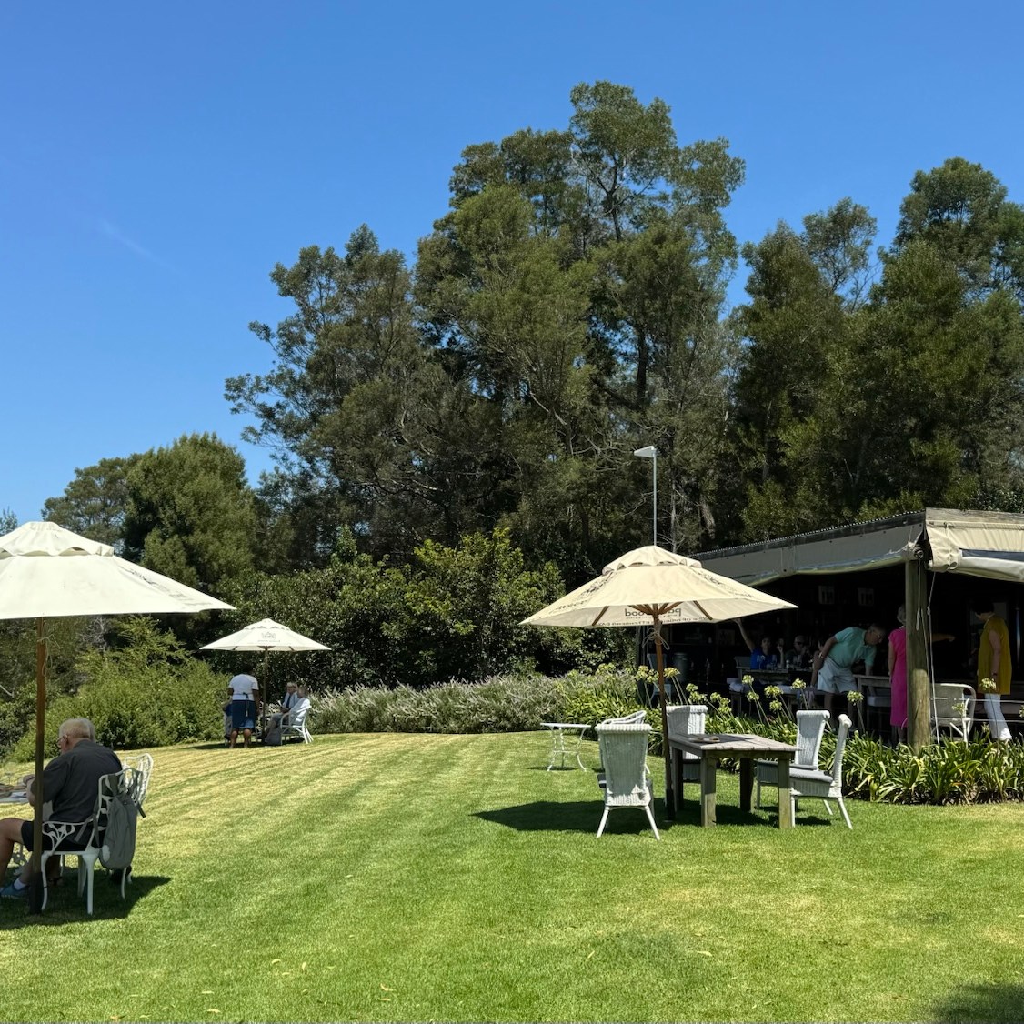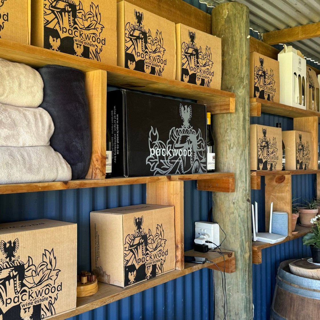 Endlich angekommen öffnet sich beim Klingeln an der Pforte das große Tor zum dem Weingut, das sich idyllisch an die hügelige Landschaft schmiegt. Vom Parkplatz aus steht linker Hand ein Häuschen mit der Aufschrift „tasting room“, das allerdings an sehr heißen Sommertagen zugunsten der Außenterrasse auf dem gegenüberliegenden Hügel nicht in Betrieb ist. Dort auf der Außenterrasse sitzt man an langen Holztischen auf dem Deck mit tollem Blick ins Tal. Auf der Wiese davor stehen vereinzelt Tische, an denen man ebenfalls Platz nehmen kann. Rein optisch erinnert hier nichts an die klassischen Weingüter im kapholländischen Stil des Western Cape. Vielmehr spricht Packwood, das erst 2006 gegründet wurde, selbst vom “Garagenstil”, der den besonderen Charme dieses Weingutes ausmacht.