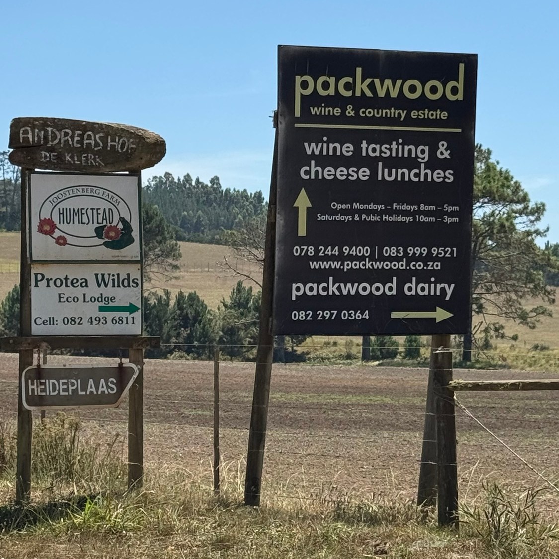 Für Weinliebhaber nimmt die Anzahl der Weingüter Richtung Osten drastisch ab und hält lediglich in der Region rund um Plettenberg noch einige wenige Estates bereit. Bramon als eines der bekanntesten sowie Kay & Monty westlich von Plettenberg in Richtung Tsitsikamma National Park gehören dazu. Zwanzig Kilometer vor Plettenberg führt aber auch eine gravel road von der N2 aus sechs Kilometer nördlich zum Weingut Packwood. Gut, dass es ab und an ausgeschildert ist, bevor man irgendwo im Nirgendwo umgedreht – denn ganz schön abseits liegt Packwood schon.