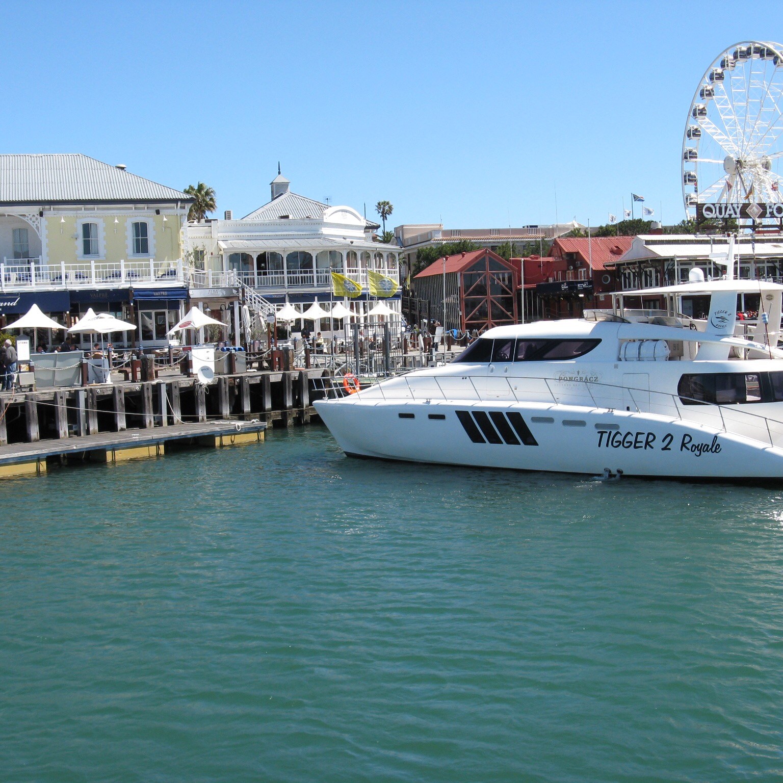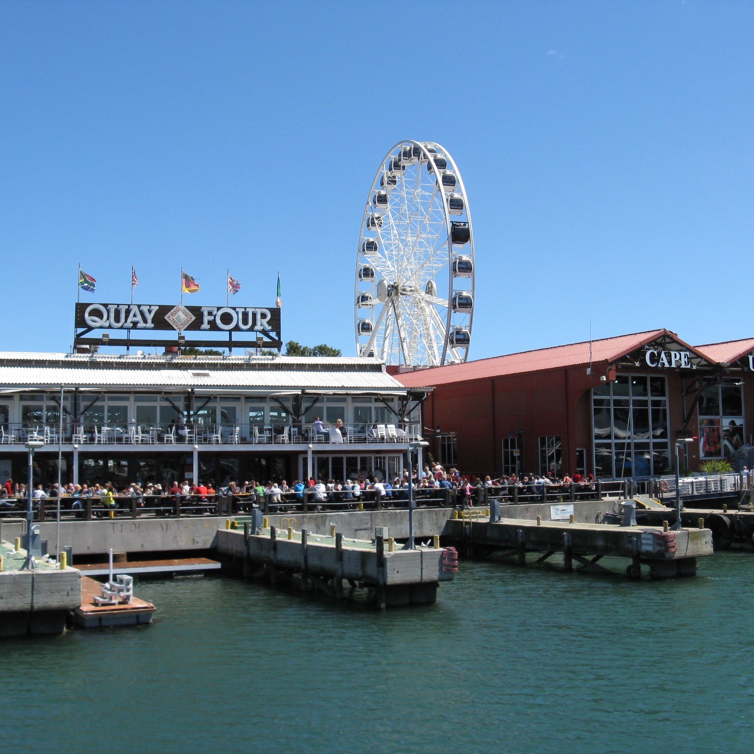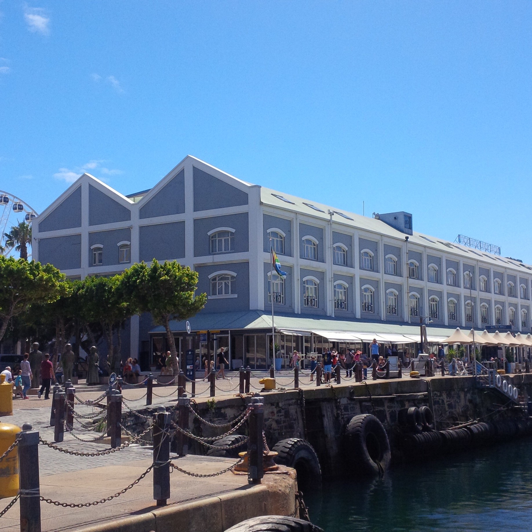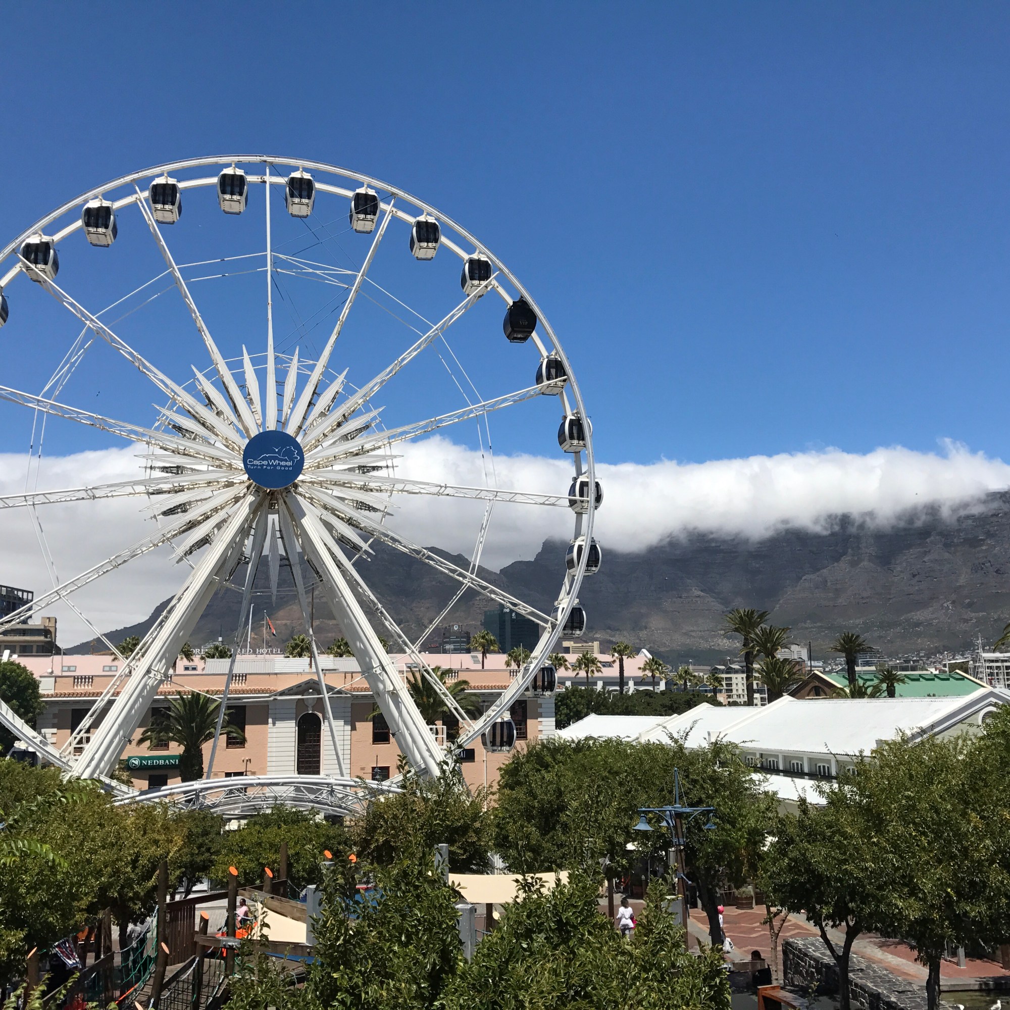 V&A Waterfront ist relativ übersichtlich und gut zu erkunden. Mittendrin stand bis Juni 2022 das Cape Wheel, ein Riesenrad direkt vor der Victoria Wharf, einem großen Einkaufszentrum mit zahlreichen Restaurants, die für jeden Geschmack etwas bereit halten. Vor dem Eingang zur Mall musizieren mehrfach am Tag afrikanische Künstler, ein Spektakel zum Verweilen. Das Cape Wheel wechselte seinen Standort im südafrikanischen Sommer 2023 hinter die Victoria Wharf.