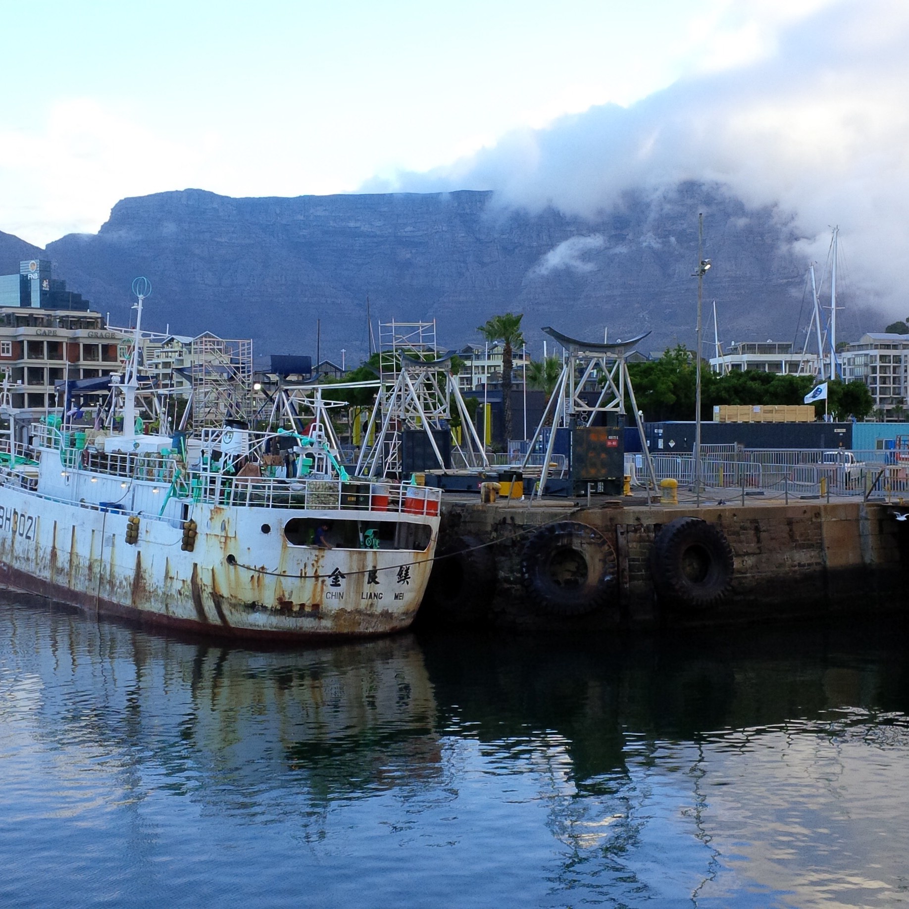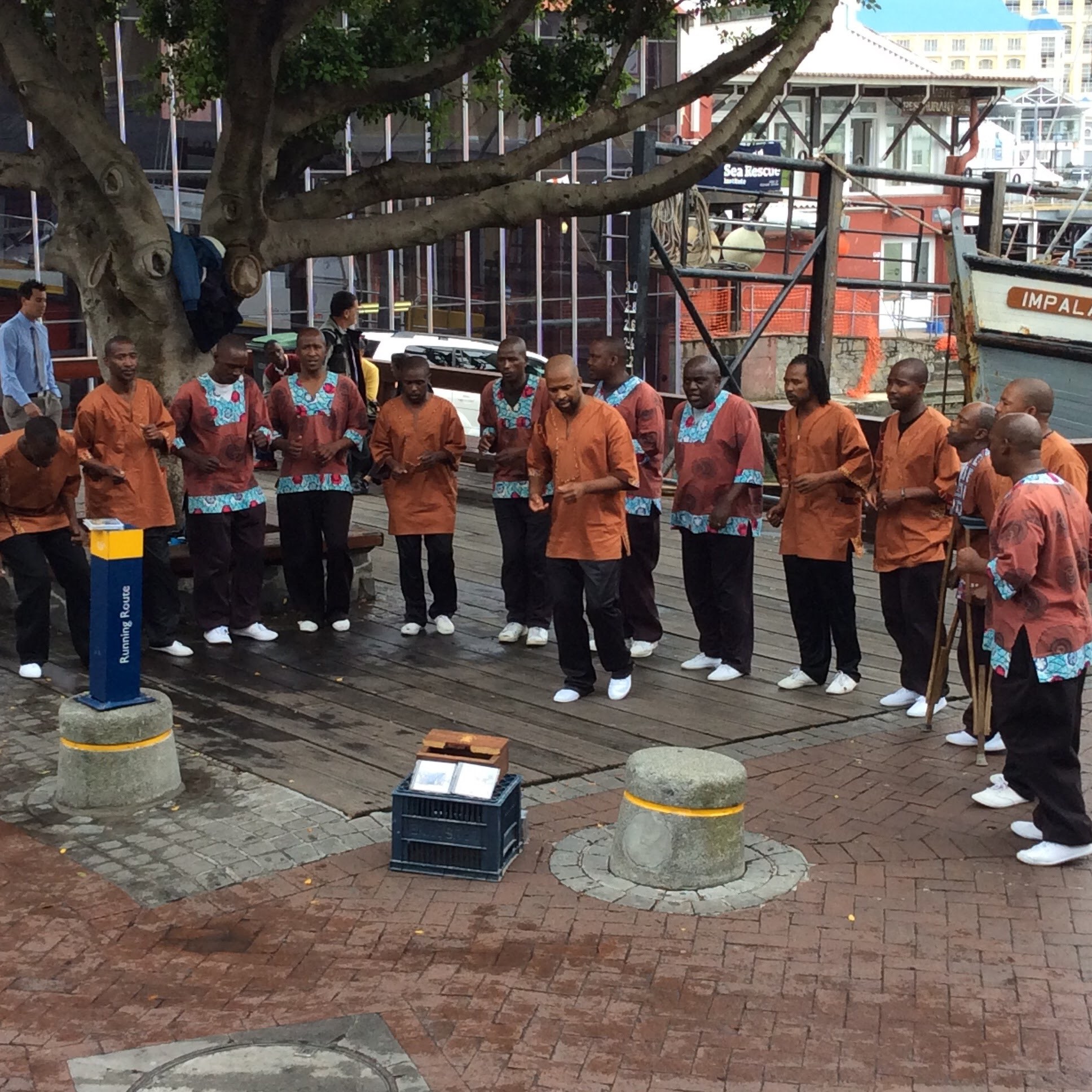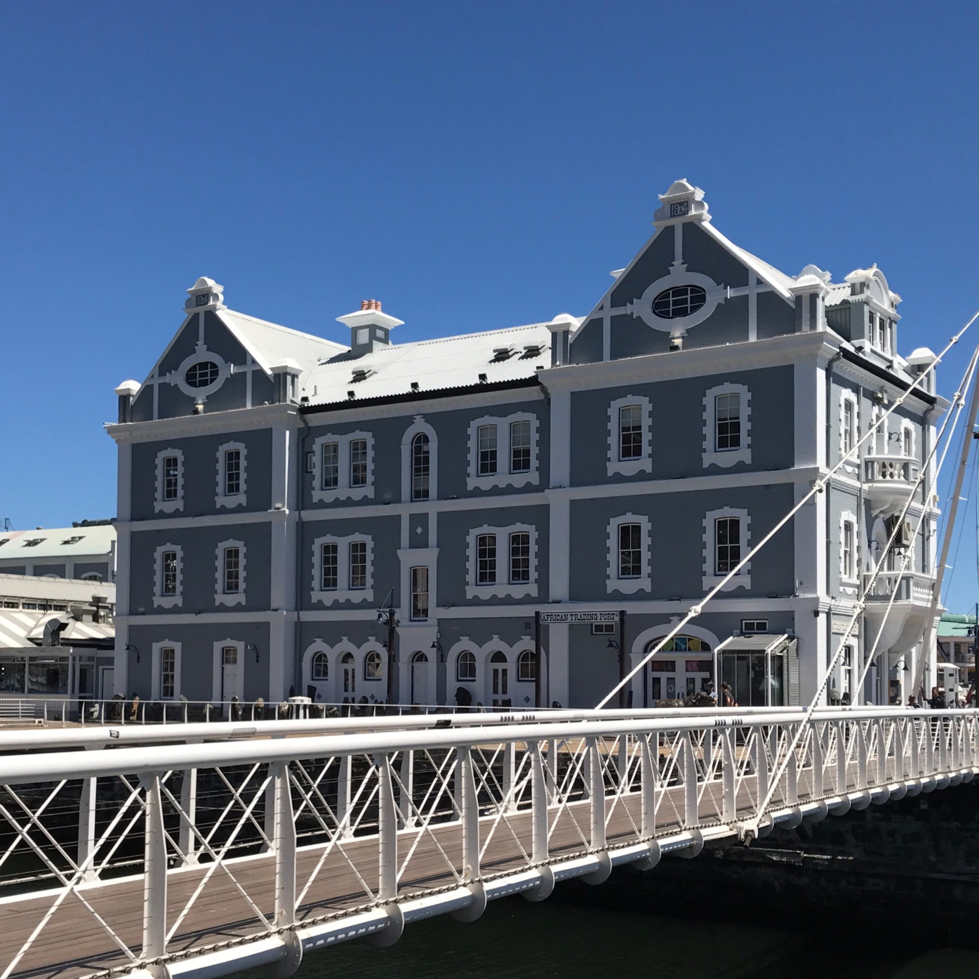 Nach der Fotosession sieht man beim Zurück-Überqueren der Schwingbrücke linker Hand gen Süden das Alfred Bassin, das zweite, deutlich kleinere Hafenbecken. Um das Old Port Captain’s Building (African Trading Port) herum gelangt man am National Geografic Fotorahmen mit Blick zum Tafelberg vorbei zur Alfred Mall, wiederum mit zahlreichen kleinen Geschäften. Auf der anderen Seite der Mall zurück Richtung Victoria Wharf kann man bei eine kleinen Pause auch hier afrikanischen Künstlern beim Musizieren lauschen.