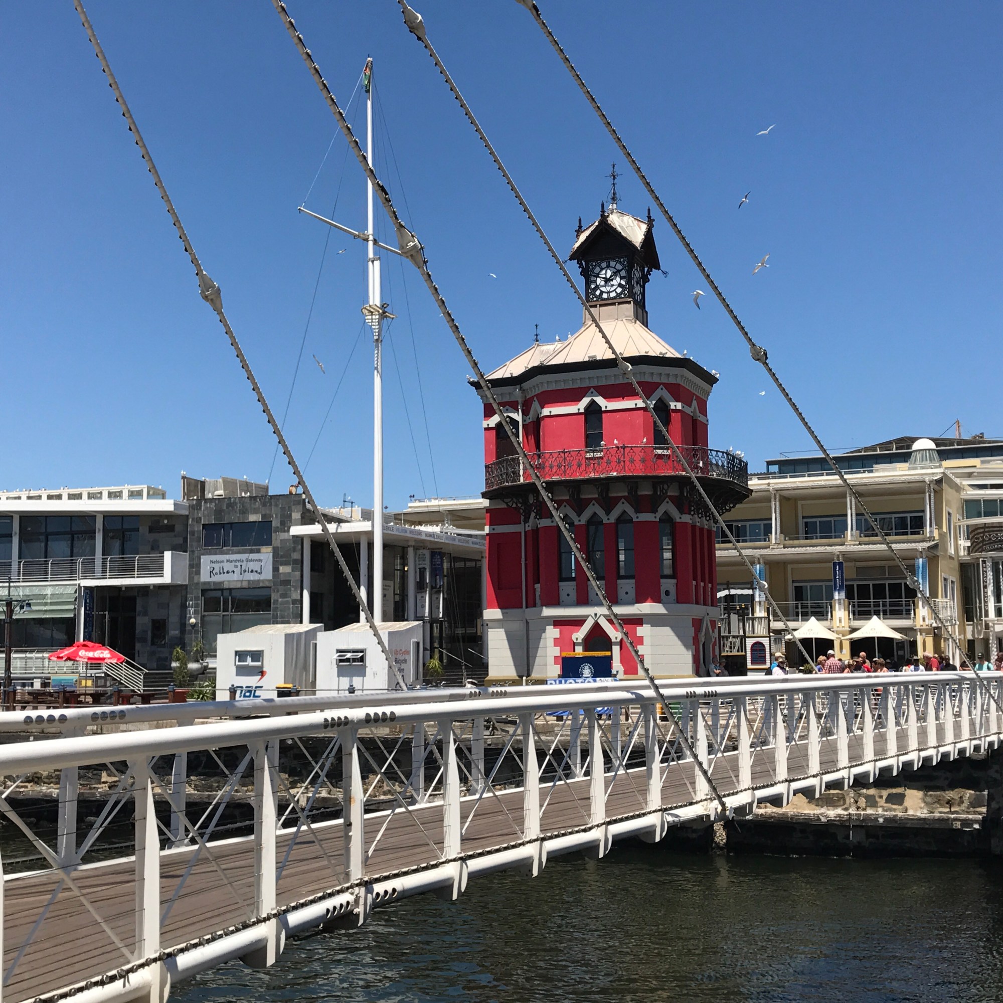 Vom Victoria Bassins, allerdings von der östlichen Seite aus, starten die Schiffe nach Robben Island von einem Terminal, der unmittelbar hinter dem berühmten Clock Tower liegt. Dorthin gelangt man über einen kleine Brücke, die für den Schiffsverkehr regelmäßig geöffnet wird und dafür zur Seite „schwingt“. Ein kleines Erlebnis für alle Besucher, die sich nach Freigabe ganz entsprechend des Linksverkehrs in Südafrika von einer Kaikante zur anderen wandern und dabei noch ein typisches Foto machen. Ein Stückchen weiter hinter dem Clock Tower findet man auch das Zeitz MOCAA – Museum für zeitgenössische Kunst Afrika und das The Silo Hotel, die beide einen alten Getreidespeicher zu neuem Leben erweckt haben.